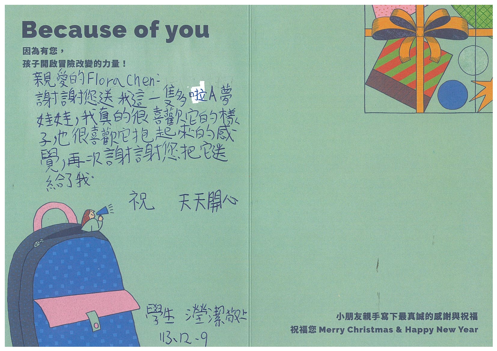 FloraChen 您好:我們在12/7(六)將禮物發送到孩子的手上嚕! 在發送禮物前,我們特別為孩子設計〈品格營〉及〈反思課程〉, 最後進行〈冒險小勇者聖誕挑戰賽〉,希望能讓孩子們從心裡面長出勇氣與自信。