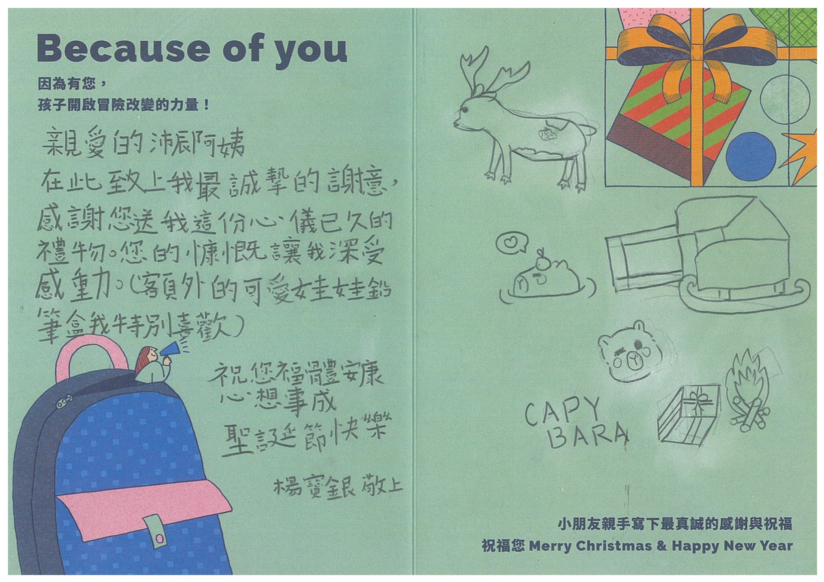 每份聖誕禮物內容:小朋友許下的心願禮物+親手寫下的鼓勵祝福卡片1張