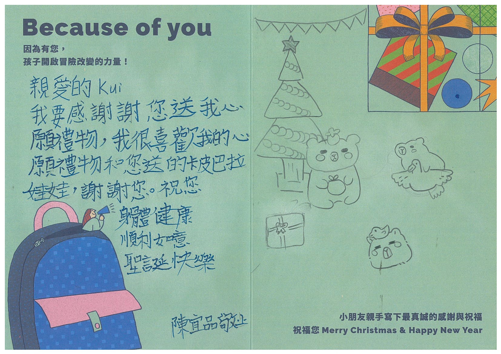 每份聖誕禮物內容:小朋友許下的心願禮物+親手寫下的鼓勵祝福卡片1張
