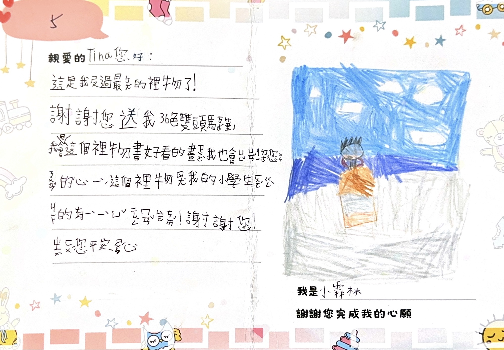 小霖林是一個各方面皆呈現滿分的小男孩,在家中排行老三,上面有一位哥哥與一位姐姐,會有如此成熟的行為是因為孩子對自己也有所要求,時常展現貼心的一面,不讓外人擔心他太多;因家中有三個小孩,文具的需求量極大,孩子目前小二對於彩色筆的需求也隨著年紀日益增加,因此期許自己在這次的禮物能獲得一盒雙頭的彩色筆,未來將會藉由粗細不同的顏色會畫出唯妙唯肖的圖畫! TengYue雙頭油性馬克筆麥克筆36色(供參考使用,準備相似禮物皆可): https://reurl.cc/5KK9vq