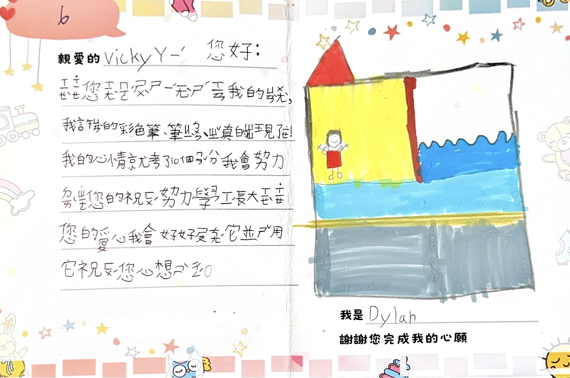 謝謝您熱情參與「2025 大聯大愛心圓夢計畫」,我們已經將您的心意,傳遞到孩子的手上囉!為了將這一切記錄下來,我們將孩子親手寫給您的感謝卡片掃描成圖檔上傳至此,讓您可以回顧這一整個歷程。再一次謝謝您的無私奉獻和積極參與,期待我們能夠持續在生活中充滿幸福,一同共創夥伴價值,成就更加美好的未來!