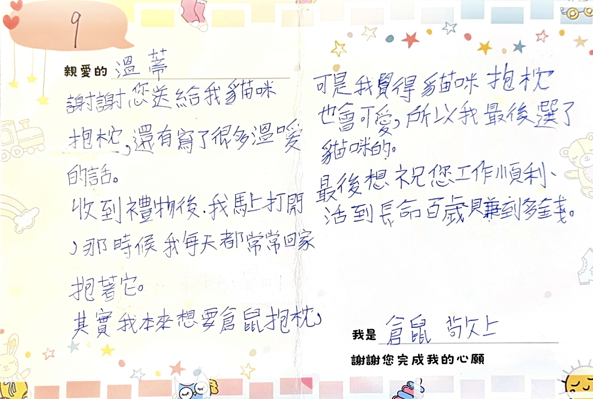 謝謝您熱情參與「2025 大聯大愛心圓夢計畫」,和我們一起實現了孩子們的夢想,用一個心願禮物陪伴他們的成長。我們會協助將您的心意,親手傳遞到孩子的手上;後續也會將孩子寫給您的感謝卡片,掃描上傳至心願平台。