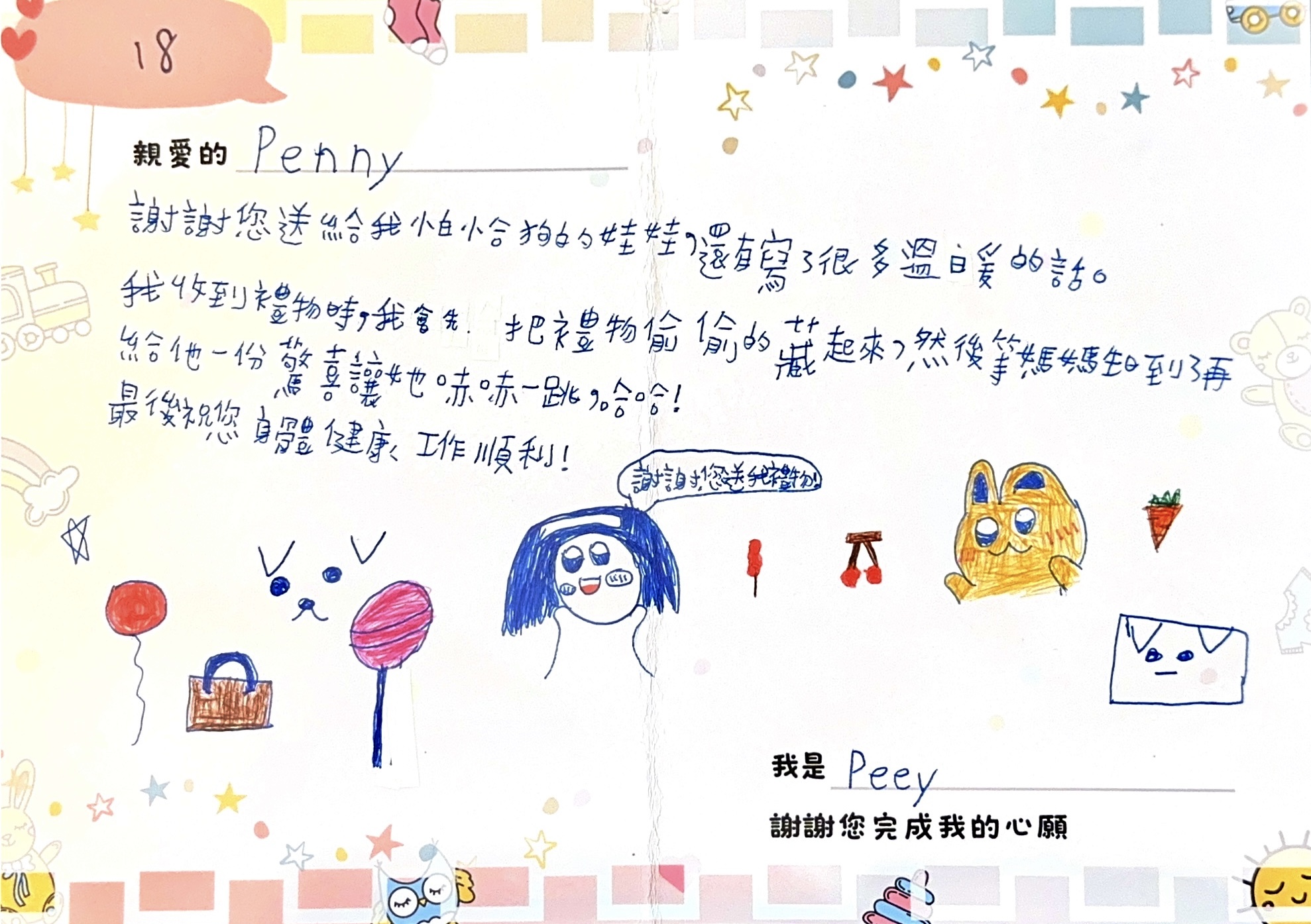 • 備註 Peey在閱讀理解方面稍顯弱勢,經常需要老師的引導與協助才能掌握題意。不過她在班上總是話題不斷,口語表達能力佳,能言善道,與同學互動熱絡。雖然偶爾對老師的語氣略顯直接,但已有明顯進步,態度也在慢慢調整中。母親節即將到來,他最先想到的不是自己,而是想為辛苦的媽媽準備一份驚喜,因此這次許願能獲得一個媽媽最喜歡的三麗鷗角色——帕洽狗娃娃,親手送給媽媽當作溫馨的節日禮物。
