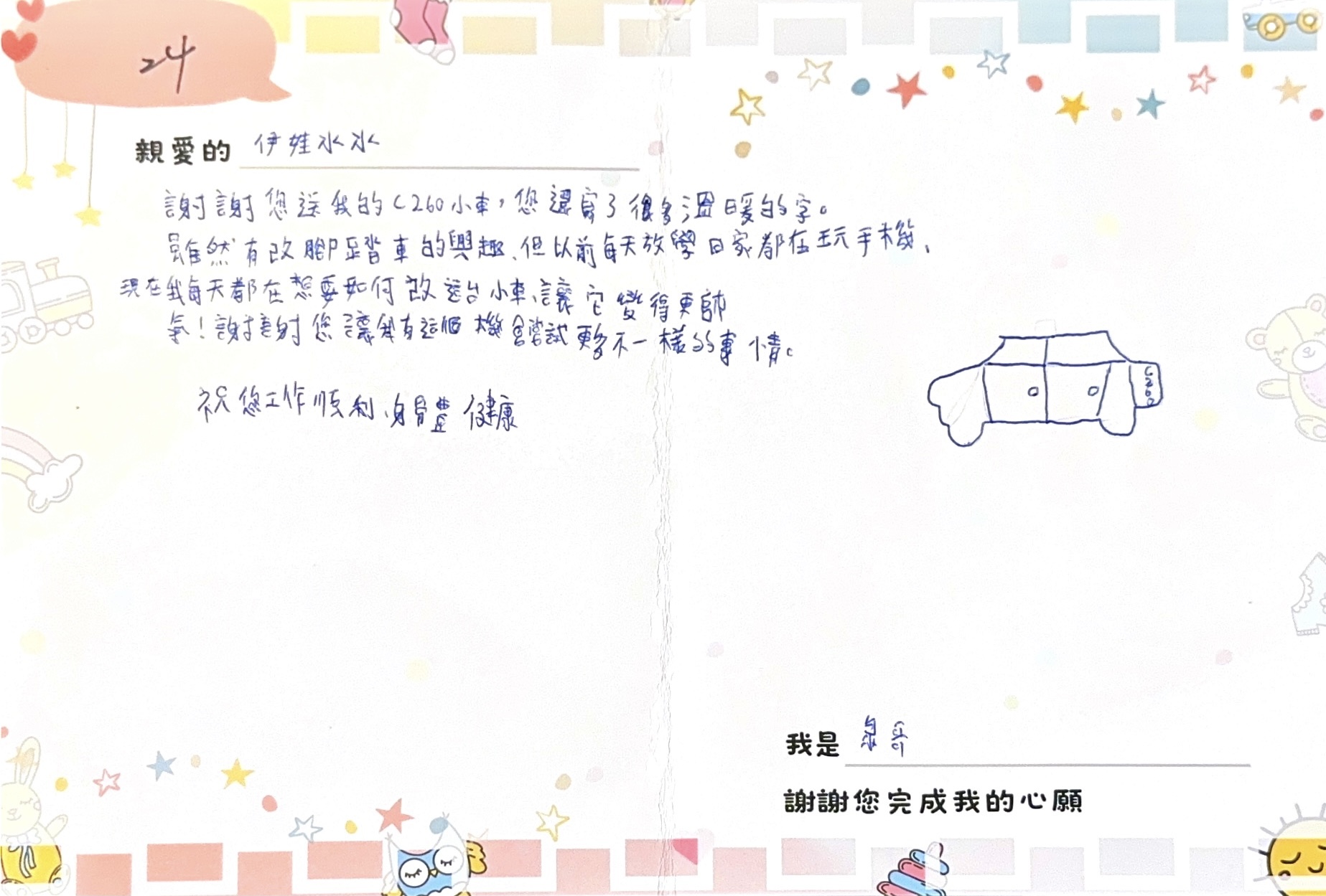 謝謝您熱情參與「2025 大聯大愛心圓夢計畫」,和我們一起實現了孩子們的夢想,用一個心願禮物陪伴他們的成長。我們會協助將您的心意,親手傳遞到孩子的手上;後續也會將孩子寫給您的感謝卡片,掃描上傳至心願平台。
