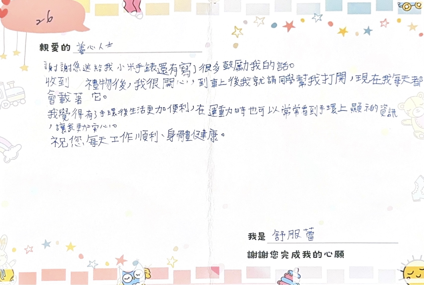 • 備註 舒服蕾是開朗陽光女孩,對於師長交代的功課任務皆能完成,與同學的相處和睦,平常喜歡運動揮灑汗水,因為喜歡運動比賽,所以希望能擁有一支智慧型手錶能看時間並記錄自己的身體狀況,同時能提醒自己的身體狀況,夢想未來能成為運動員。