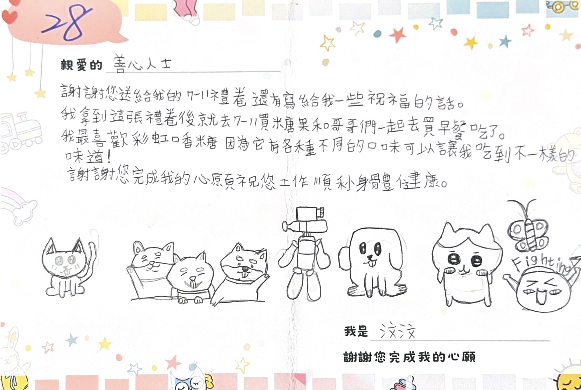 • 備註 汶汶個性活潑、樂於分享,在班上總是充滿朝氣,深受同學喜愛。她與家人感情緊密,目前與爸爸、媽媽和三位手足同住。家中有四個孩子,經濟負擔較重,但父母仍努力工作、用心照顧孩子的生活與學習。媽媽特別重視孩子的成長,也常與老師保持聯繫,關心孩子在學校的表現。 汶汶一家常在711購買日用品,對這個多子女家庭來說,711既便利又實用,但因開銷多、支出緊湊,經常無法購齊所需物品。汶汶許願希望能獲得一張500元711商品卡,幫助家中補足日常用品,也能讓她和手足偶爾享有一點小小的幸福。