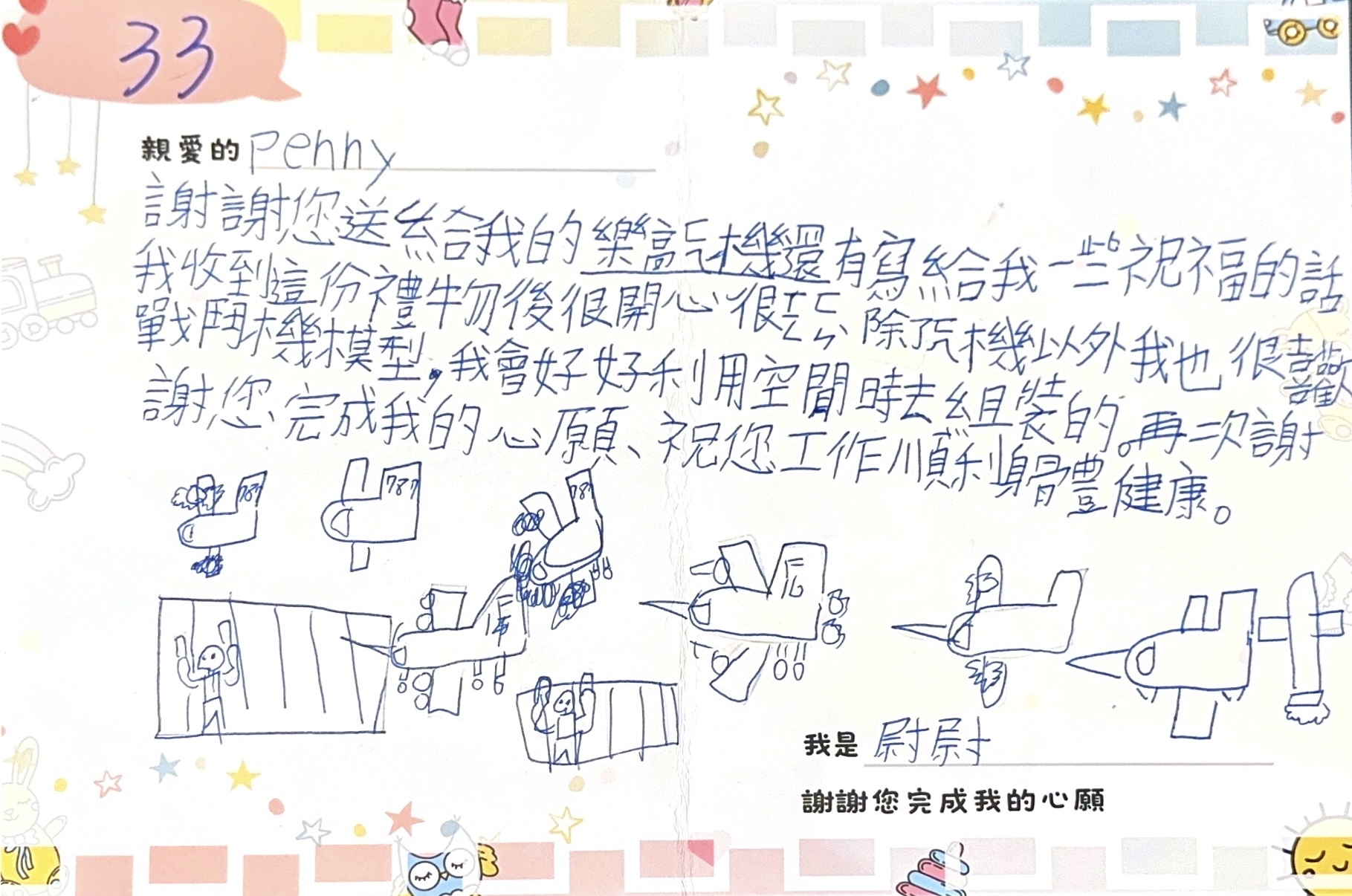 謝謝您熱情參與「2025 大聯大愛心圓夢計畫」,和我們一起實現了孩子們的夢想,用一個心願禮物陪伴他們的成長。我們會協助將您的心意,親手傳遞到孩子的手上;後續也會將孩子寫給您的感謝卡片,掃描上傳至心願平台。