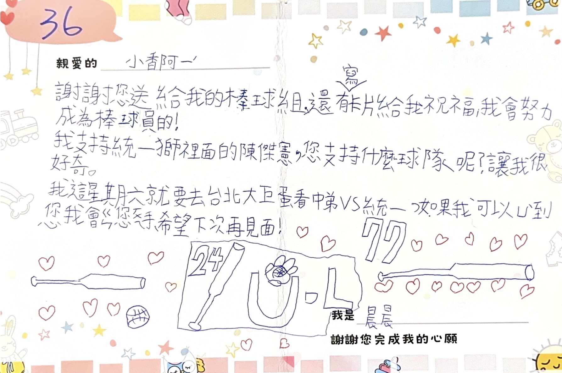• 備註 晨晨年紀還小,父母卻已分開生活,平時由媽媽照顧,爸爸雖遠在南部,但會每兩週定期探望、帶他出去玩,雖然爸爸與媽媽沒有同住,給晨晨的愛卻未曾減少。去年他和弟弟迷上了棒球,台灣奪下金牌時,他也開心了好幾天,不論是在學校還是家中,總會想聊有關棒球的事情。他一直希望能擁有一組棒球套裝,親自與弟弟一起體驗雙方都熱愛的運動,但媽媽認為孩子年紀還小,怕買了會浪費,因此遲遲未能實現他的心願。