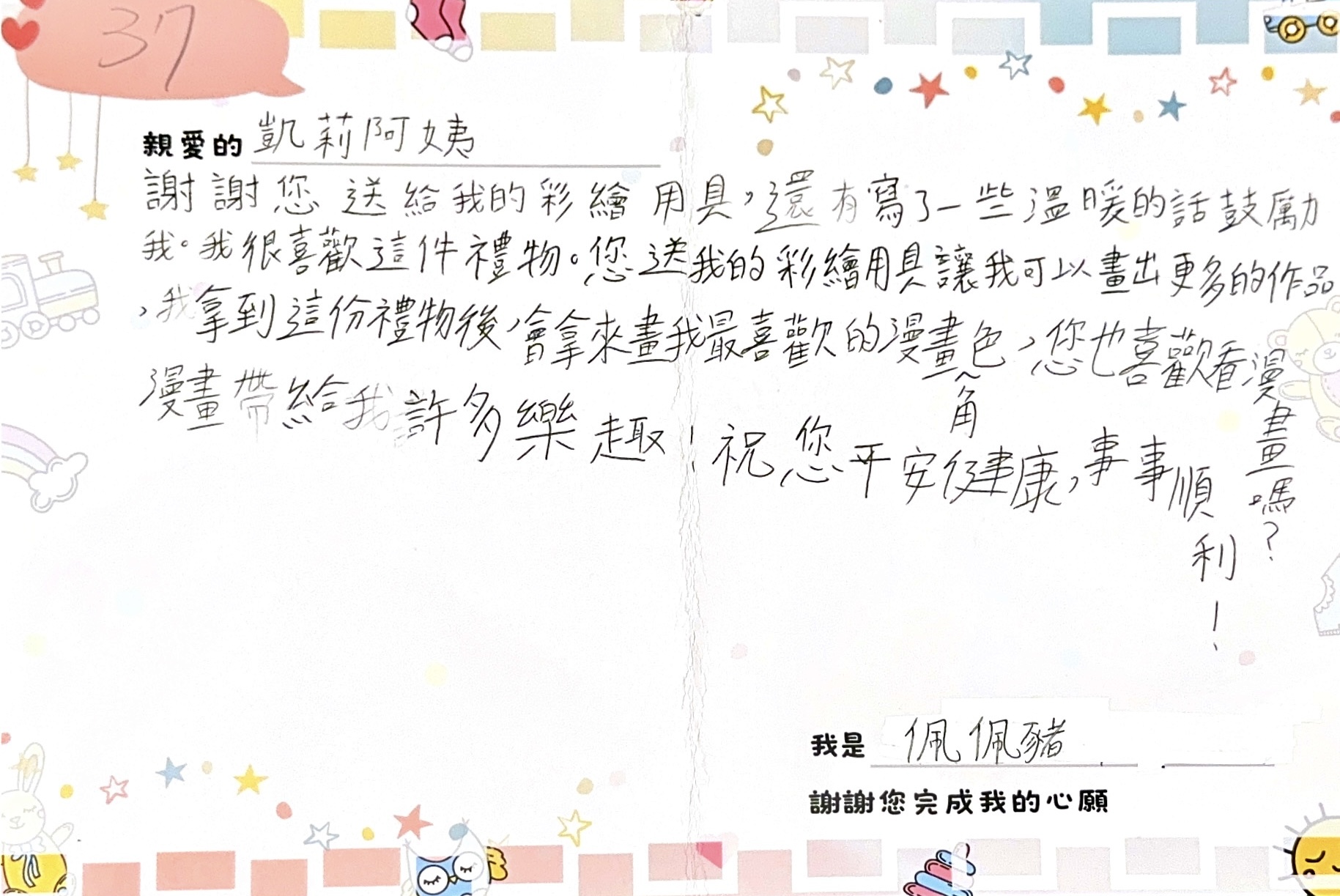• 備註 佩佩豬是一位即將升國中的女孩,對藝術充滿熱情,喜歡畫畫,也熱愛音樂,尤其擅長吹直笛。上次,她在大家面前自信地表演吹奏,甚至不需要看譜,展現了她的才華。但佩佩豬的家庭情況較為困難,雙親都是計程車司機,每天早出晚歸,讓她不僅要獨自照顧家務,還需要煮晚餐給弟弟一起吃,生活十分辛苦。由於家裡沒有多餘的錢,她無法購買新的美術用具,只能向同學借來使用,但久而久之,同學也不太願意借給她了。她希望能擁有一套自己的繪畫組,這樣不僅能讓她不再依賴他人,還能將自己擁有的工具分享給其他需要的同學,讓她在藝術的道路上,可以和更多人一起成長,也更有自信。