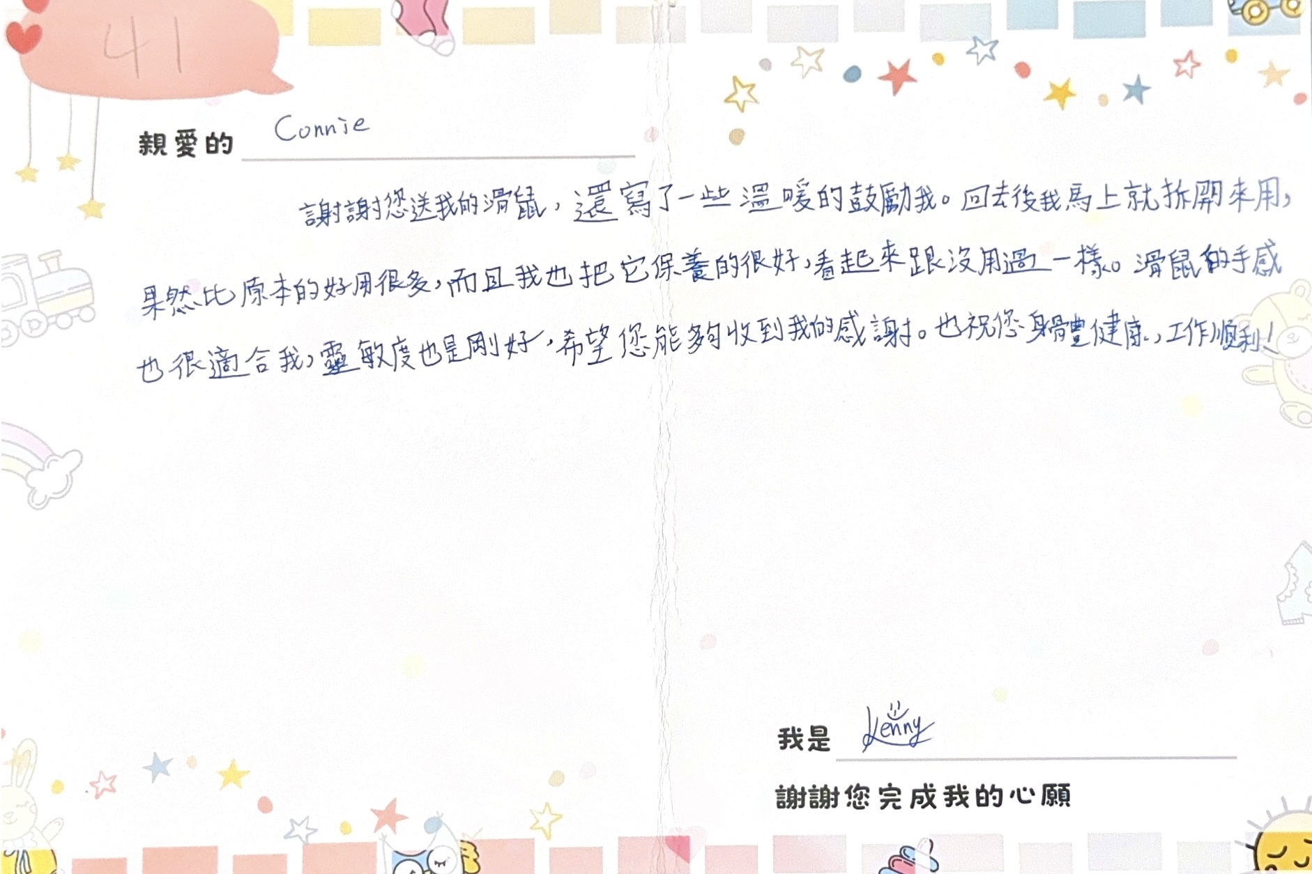 • 備註 孩子的哥哥姊姊都已經長大成人,平時也不太會回家,與家人感情雖好,但甚少見面。Kenny 是一位聰明且認真的孩子,未來要考的高中是彰化男校第一志願(彰中),對於學習是很勤勉的。平常的他很少開口請求任何禮物,這次難得地希望能有一個滑鼠,讓他在使用電腦查資料或寫作業時更加便利,也能提升學習效率。這是他的一個小小心願,也是一份能實際幫助他準備升學的支持。
