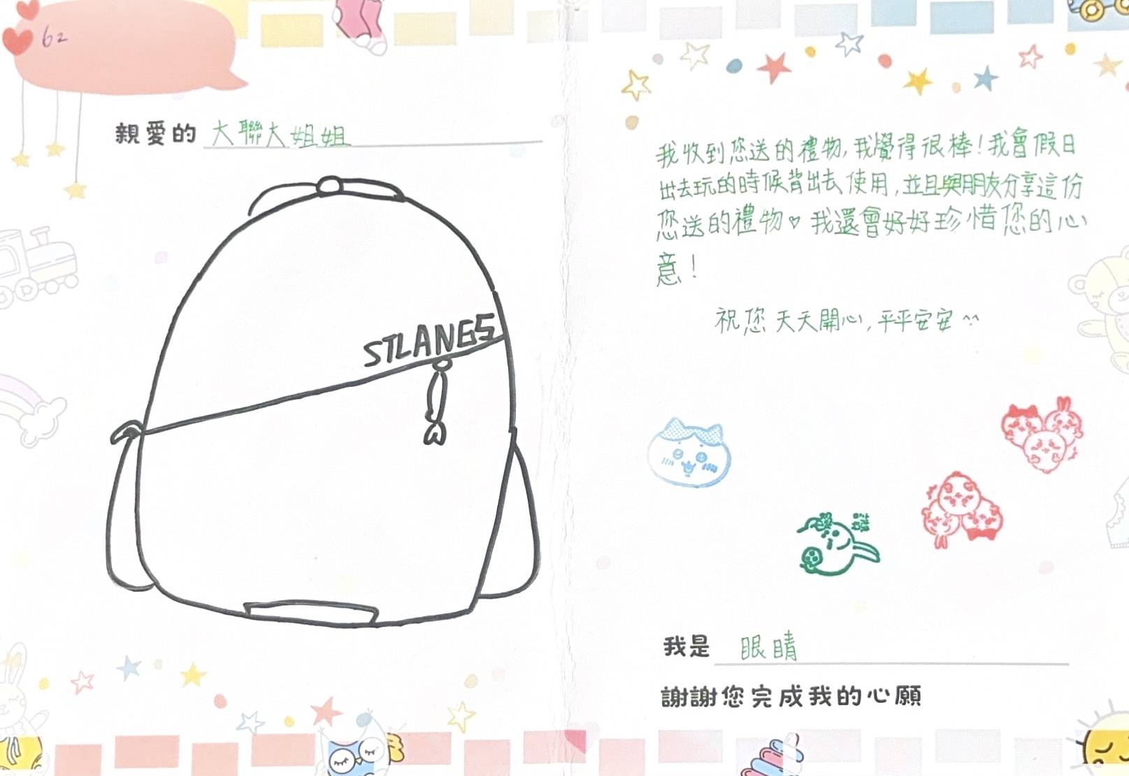 謝謝您熱情參與「2025 大聯大愛心圓夢計畫」,和我們一起實現了孩子們的夢想,用一個心願禮物陪伴他們的成長。我們會協助將您的心意,親手傳遞到孩子的手上;後續也會將孩子寫給您的感謝卡片,掃描上傳至心願平台。