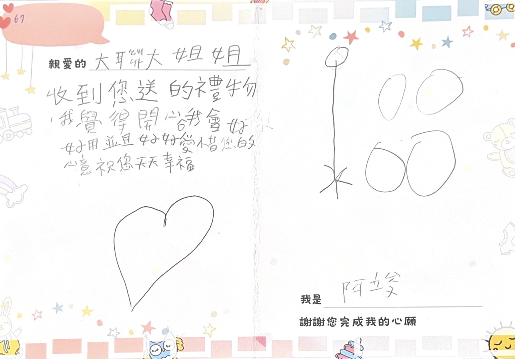 謝謝您熱情參與「2025 大聯大愛心圓夢計畫」,和我們一起實現了孩子們的夢想,用一個心願禮物陪伴他們的成長。我們會協助將您的心意,親手傳遞到孩子的手上;後續也會將孩子寫給您的感謝卡片,掃描上傳至心願平台。