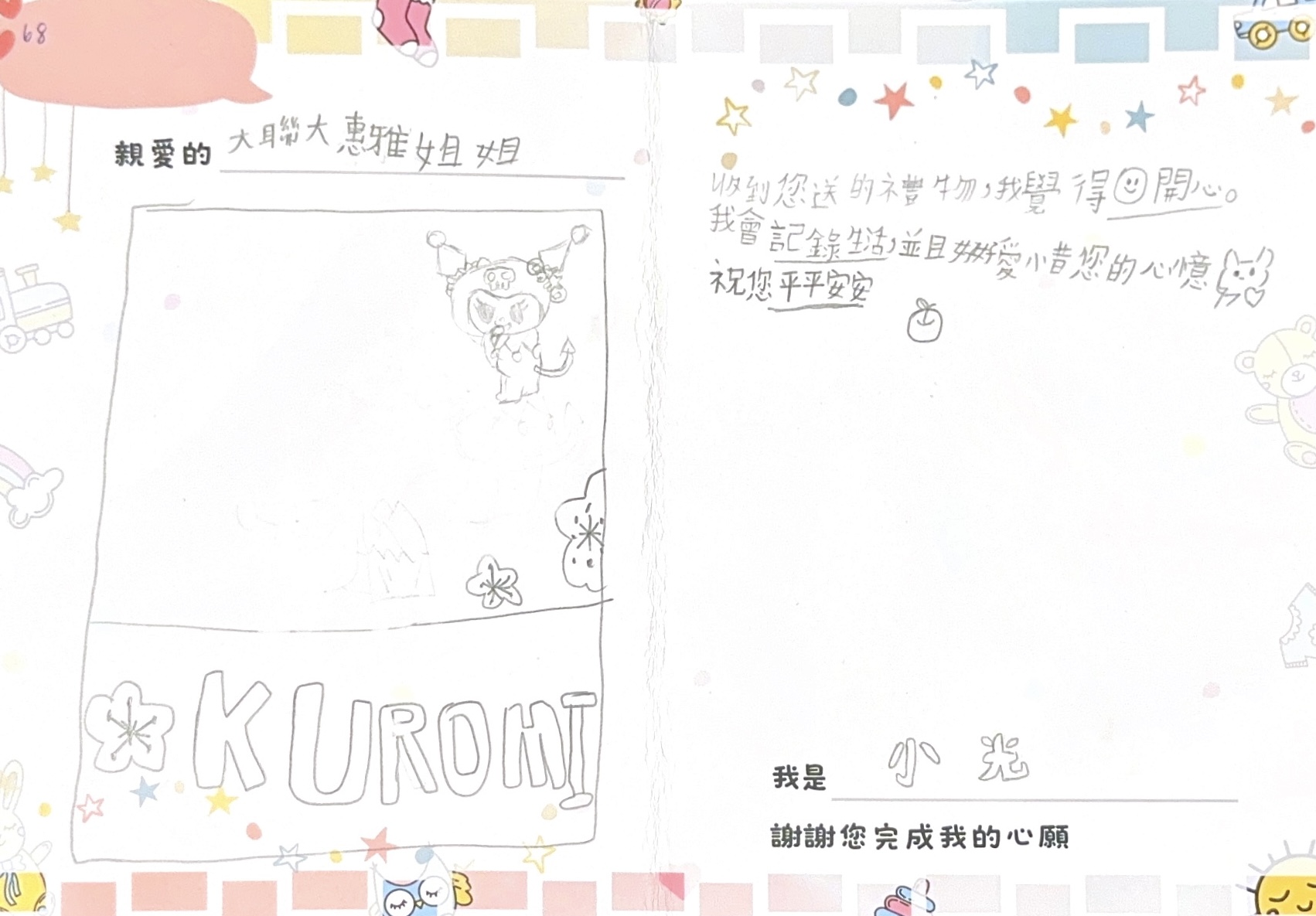 謝謝您熱情參與「2025 大聯大愛心圓夢計畫」,和我們一起實現了孩子們的夢想,用一個心願禮物陪伴他們的成長。我們會協助將您的心意,親手傳遞到孩子的手上;後續也會將孩子寫給您的感謝卡片,掃描上傳至心願平台。