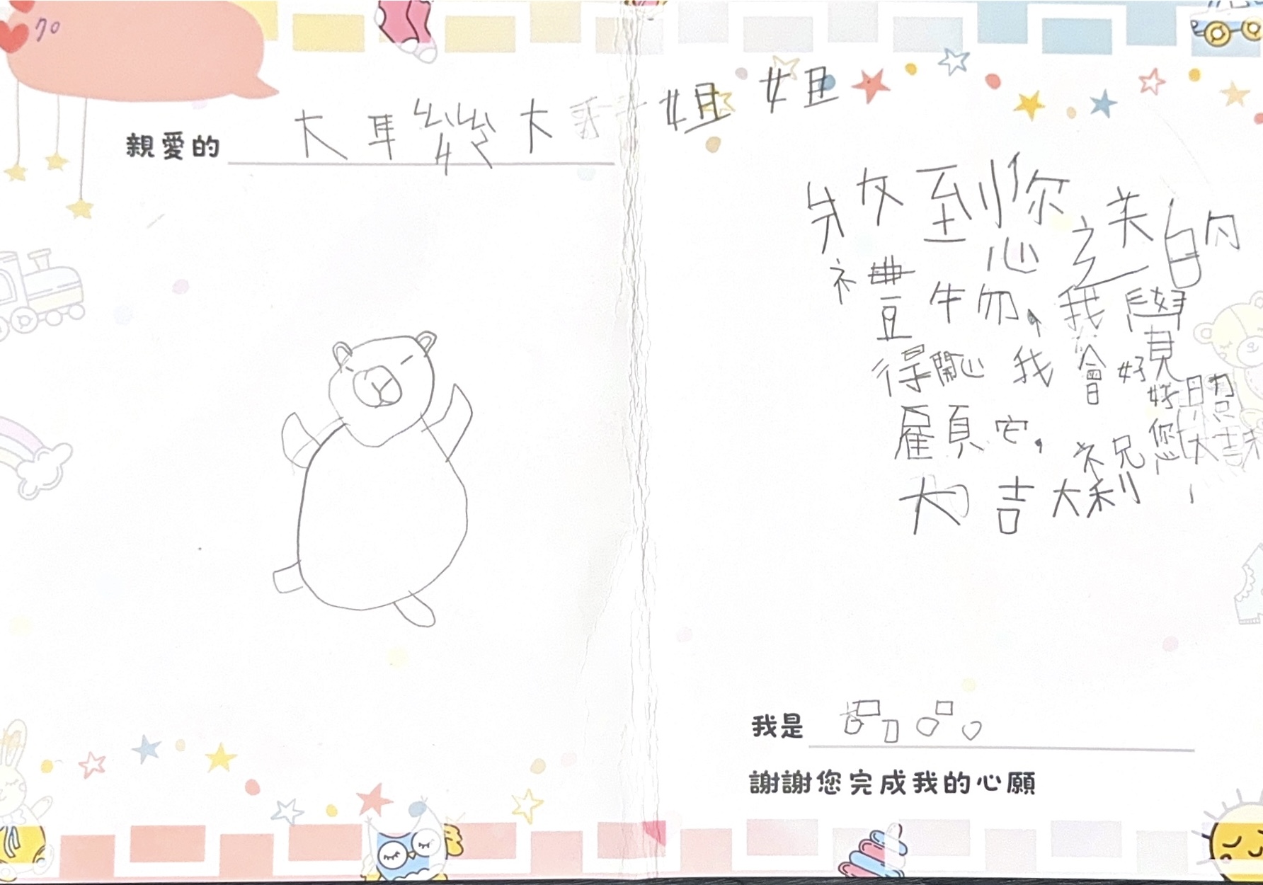 謝謝您熱情參與「2025 大聯大愛心圓夢計畫」,和我們一起實現了孩子們的夢想,用一個心願禮物陪伴他們的成長。我們會協助將您的心意,親手傳遞到孩子的手上;後續也會將孩子寫給您的感謝卡片,掃描上傳至心願平台。
