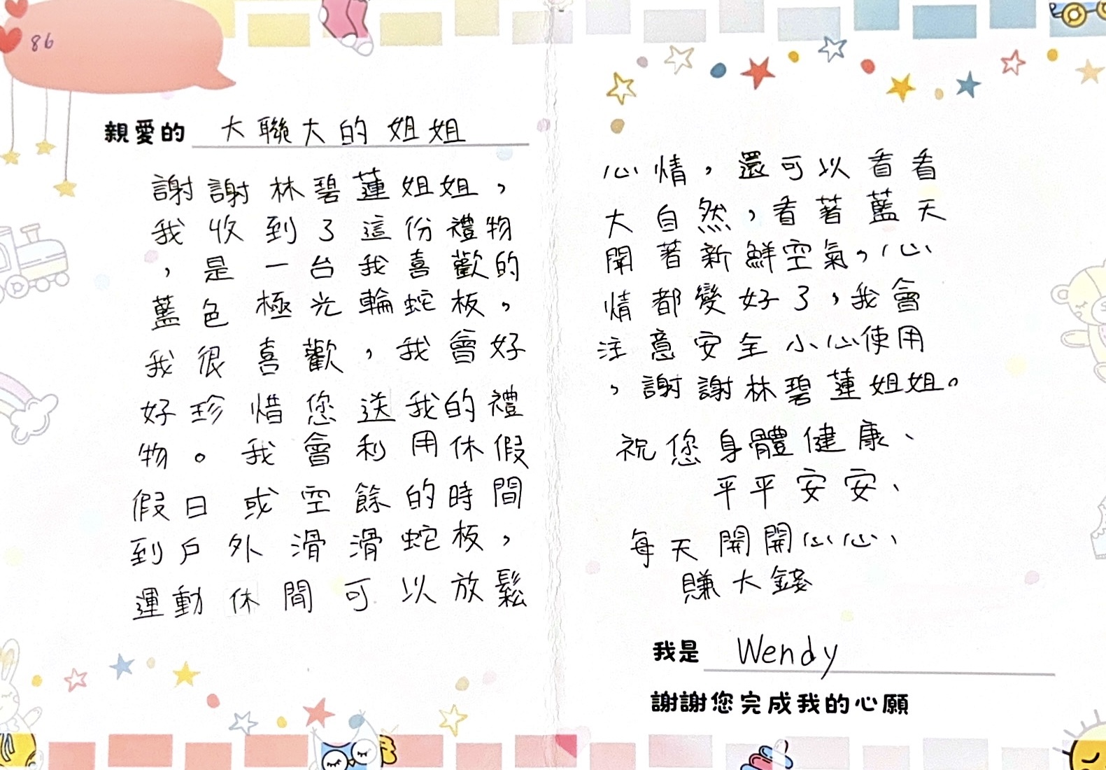 謝謝您熱情參與「2025 大聯大愛心圓夢計畫」,我們已經將您的心意,傳遞到孩子的手上囉!為了將這一切記錄下來,我們將孩子親手寫給您的感謝卡片掃描成圖檔上傳至此,讓您可以回顧這一整個歷程。再一次謝謝您的無私奉獻和積極參與,期待我們能夠持續在生活中充滿幸福,一同共創夥伴價值,成就更加美好的未來!