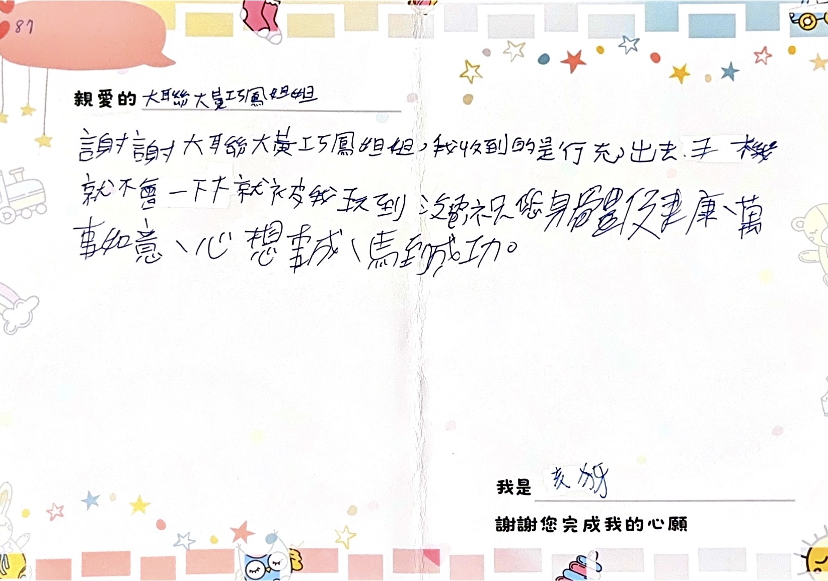 謝謝您熱情參與「2025 大聯大愛心圓夢計畫」,和我們一起實現了孩子們的夢想,用一個心願禮物陪伴他們的成長。我們會協助將您的心意,親手傳遞到孩子的手上;後續也會將孩子寫給您的感謝卡片,掃描上傳至心願平台。
