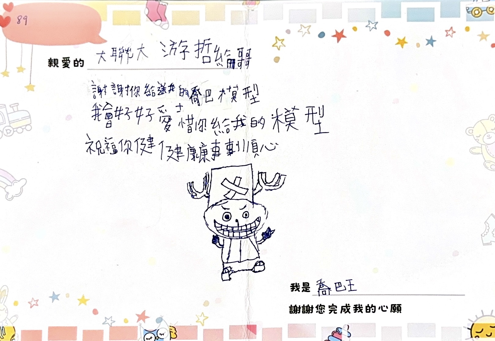 • 備註 喬巴王是家中最小的孩子,個性活潑外向,總是帶著笑容與活力面對每一天。他有兩位姊姊,但年紀與他有些差距,因此平時較少能一起玩耍,常常需要自己找樂子。喬巴王希望能擁有一組喬巴模型,這不僅是他喜愛的角色,更能成為陪伴他生活的小夥伴。在日常中,有了喬巴的陪伴,他能感受到更多快樂與安心,也讓他童年的世界多了一份屬於自己的溫暖與想像力。