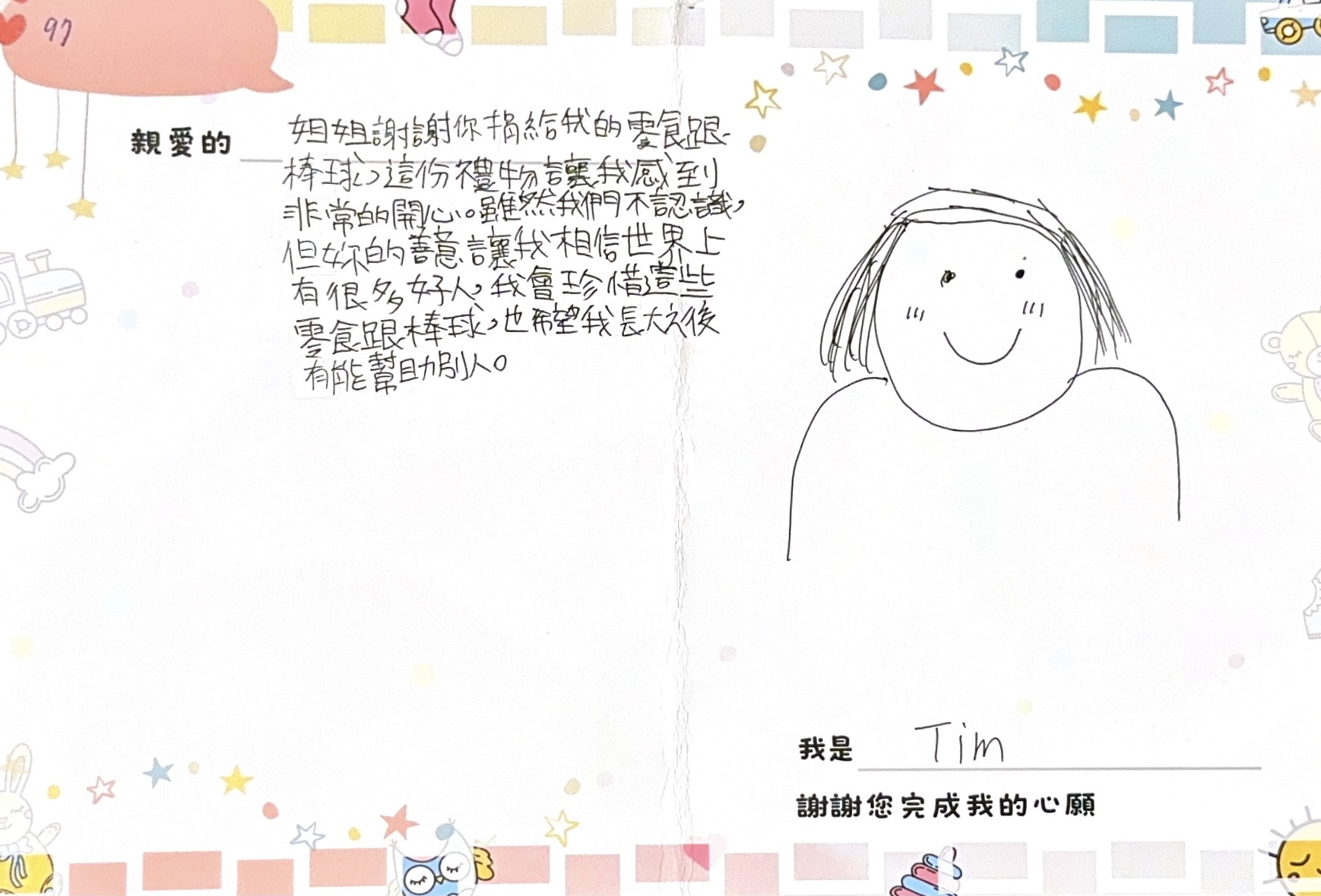 • 備註 Tim自年幼父母親便離異,由父親以及阿公阿嬤拉拔長大,父親忙碌工作時,便由阿公阿嬤照顧,幾年前阿嬤離世,年邁的阿公仍繼續陪伴學校放學的Tim,小學六年級的Tim發現學業愈來愈跟不上,便跟著好朋友來到了課輔班,希望能夠好好學習提升落後的學業。雖然Tim有想努力學習,但是當時候對於數學真的是一大罩門,好不自信,還經常對著老師拗脾氣、想放棄數學科,還好老師是一位社區媽媽,好有耐心的鼓勵,不斷的告訴Tim慢慢學、不要急、老師陪你算,花了一個暑假時間,才慢慢開導孩子,是能夠進步的!直到現在,儘管有時候仍會遇到難以理解的數學題目,不過Tim也可以先嘗試,最起碼不要排斥數學,多練習也能夠有所進步。老師問了孩子:最想要許願的禮物是什麼?Tim馬上亮起眼睛,想到的就是吃零食,因為吃了好吃的,Tim就會精神滿滿!