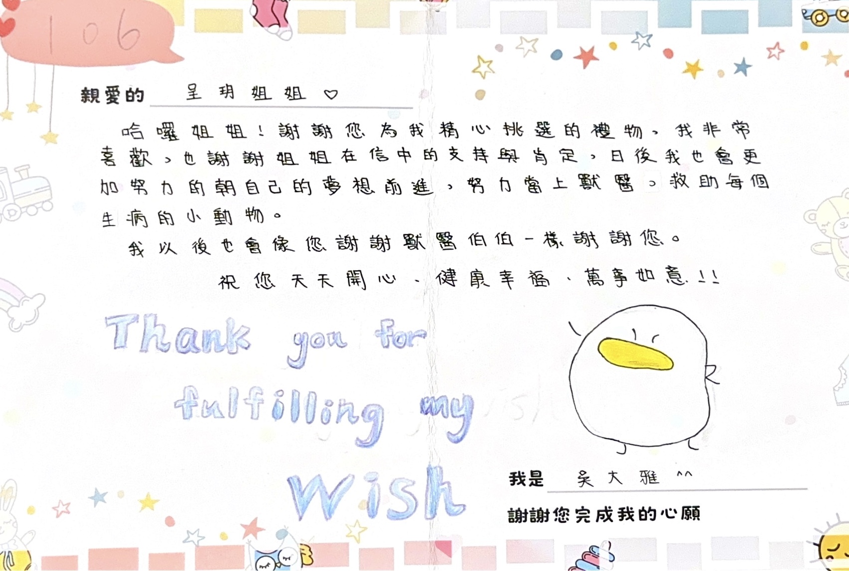 • 備註 大雅是位學習認真,對師長非常有禮貌的孩子,雖然家庭並不富裕,但教導孩子成為友善待人的人。大雅喜歡閱讀各式各樣的書籍,喜歡動物的大雅未來夢想是成為一名獸醫師。大雅希望能被圓夢的禮物是個側背包,出門在外時就能夠把物品裝著,方便帶出門了。