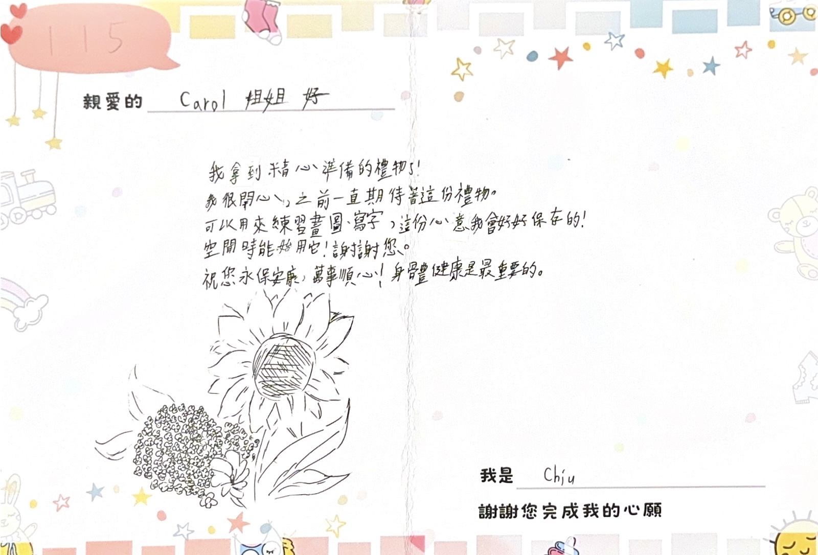 謝謝您熱情參與「2025 大聯大愛心圓夢計畫」,我們已經將您的心意,傳遞到孩子的手上囉!為了將這一切記錄下來,我們將孩子親手寫給您的感謝卡片掃描成圖檔上傳至此,讓您可以回顧這一整個歷程。再一次謝謝您的無私奉獻和積極參與,期待我們能夠持續在生活中充滿幸福,一同共創夥伴價值,成就更加美好的未來!