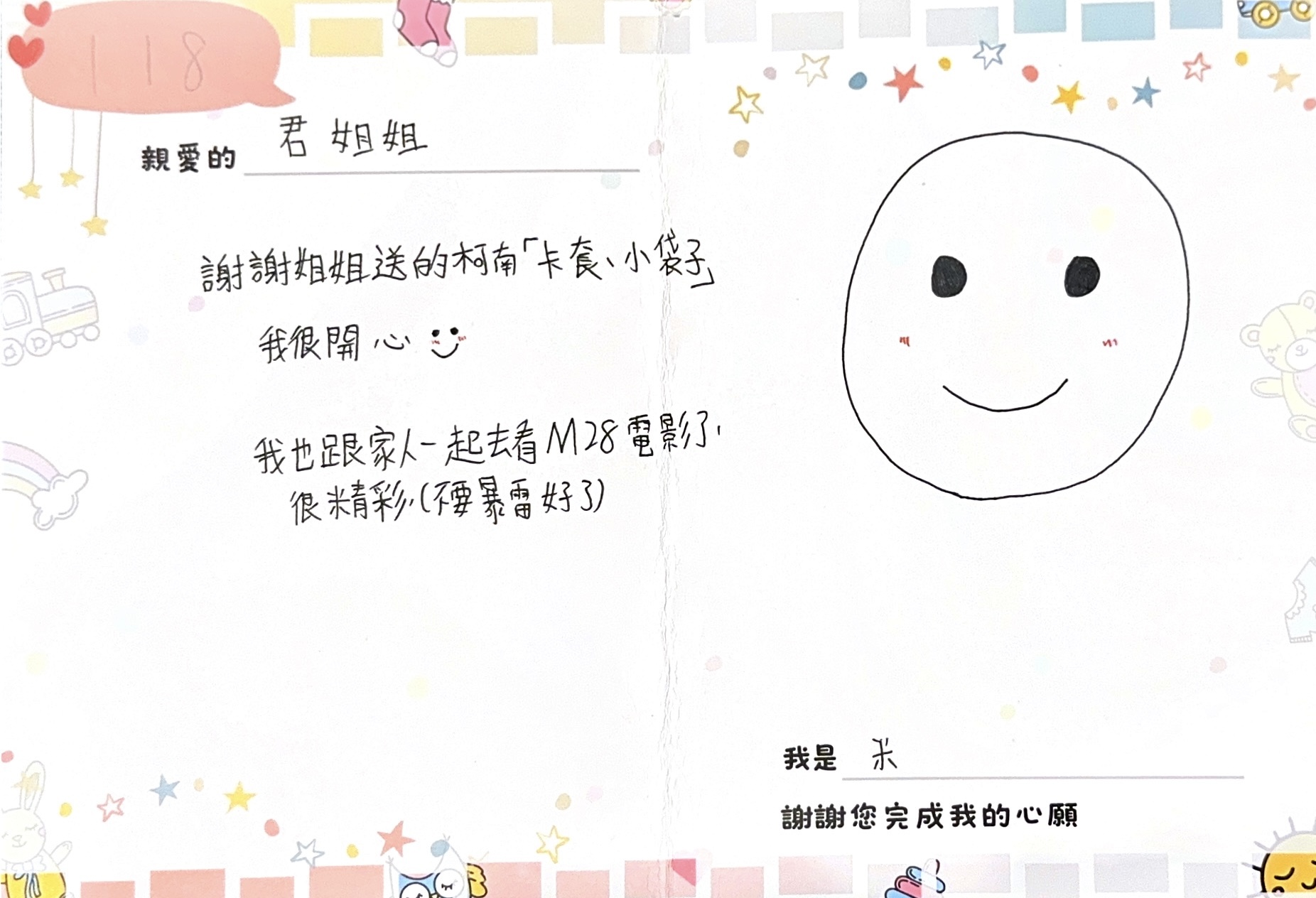 謝謝您熱情參與「2025 大聯大愛心圓夢計畫」,和我們一起實現了孩子們的夢想,用一個心願禮物陪伴他們的成長。我們會協助將您的心意,親手傳遞到孩子的手上;後續也會將孩子寫給您的感謝卡片,掃描上傳至心願平台。