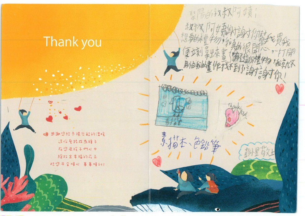 Dear 周心皓:您好,感謝您參與「 2025聚陽實業-成為那道陽光」心願活動,已將您的心意,發送到孩子的手上囉!為了將這一切永遠紀錄下來,我們將孩子給您的感謝卡片掃描成圖檔上傳至此,讓您可以回顧這一整個歷程。感謝您的愛心,未來也請繼續支持聚陽實業心願活動。如有疑問,請聯繫永續發展部-Kelly#1156、Tina#1152。