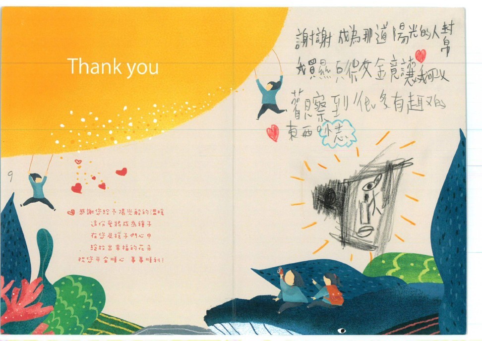 Dear 胡怡靜:您好,感謝您參與「 2025聚陽實業-成為那道陽光」心願活動,已將您的心意,發送到孩子的手上囉!為了將這一切永遠紀錄下來,我們將孩子給您的感謝卡片掃描成圖檔上傳至此,讓您可以回顧這一整個歷程。感謝您的愛心,未來也請繼續支持聚陽實業心願活動。如有疑問,請聯繫永續發展部-Kelly#1156、Tina#1152。