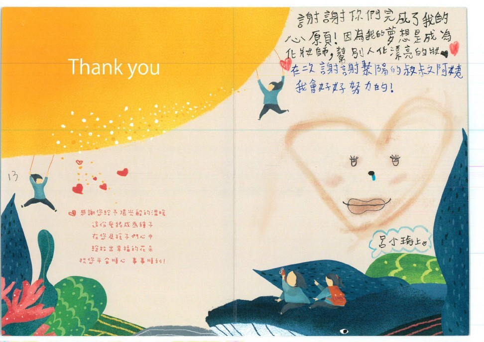 Dear 蘇意嵐:您好,感謝您參與「 2025聚陽實業-成為那道陽光」心願活動,已將您的心意,發送到孩子的手上囉!為了將這一切永遠紀錄下來,我們將孩子給您的感謝卡片掃描成圖檔上傳至此,讓您可以回顧這一整個歷程。感謝您的愛心,未來也請繼續支持聚陽實業心願活動。如有疑問,請聯繫永續發展部-Kelly#1156、Tina#1152。