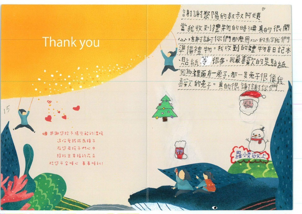 Dear 馬瑞鴻:您好,感謝您參與「 2025聚陽實業-成為那道陽光」心願活動,已將您的心意,發送到孩子的手上囉!為了將這一切永遠紀錄下來,我們將孩子給您的感謝卡片掃描成圖檔上傳至此,讓您可以回顧這一整個歷程。感謝您的愛心,未來也請繼續支持聚陽實業心願活動。如有疑問,請聯繫永續發展部-Kelly#1156、Tina#1152。