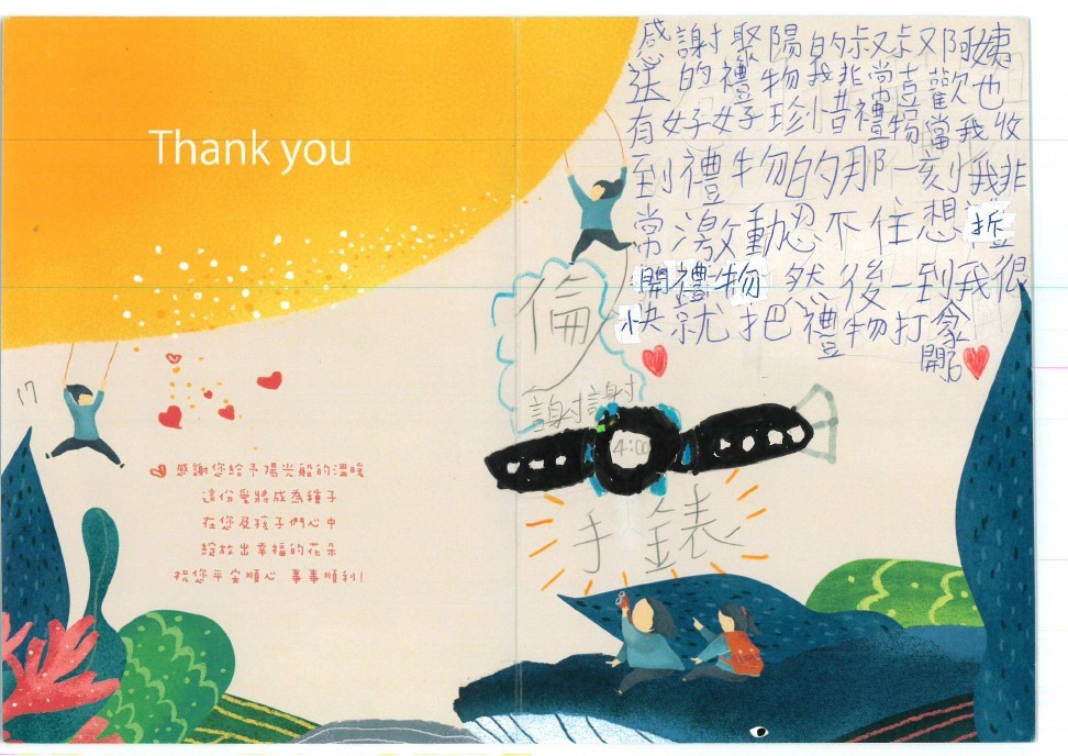 Dear 林宜儒:您好,感謝您參與「 2025聚陽實業-成為那道陽光」心願活動,已將您的心意,發送到孩子的手上囉!為了將這一切永遠紀錄下來,我們將孩子給您的感謝卡片掃描成圖檔上傳至此,讓您可以回顧這一整個歷程。感謝您的愛心,未來也請繼續支持聚陽實業心願活動。如有疑問,請聯繫永續發展部-Kelly#1156、Tina#1152。