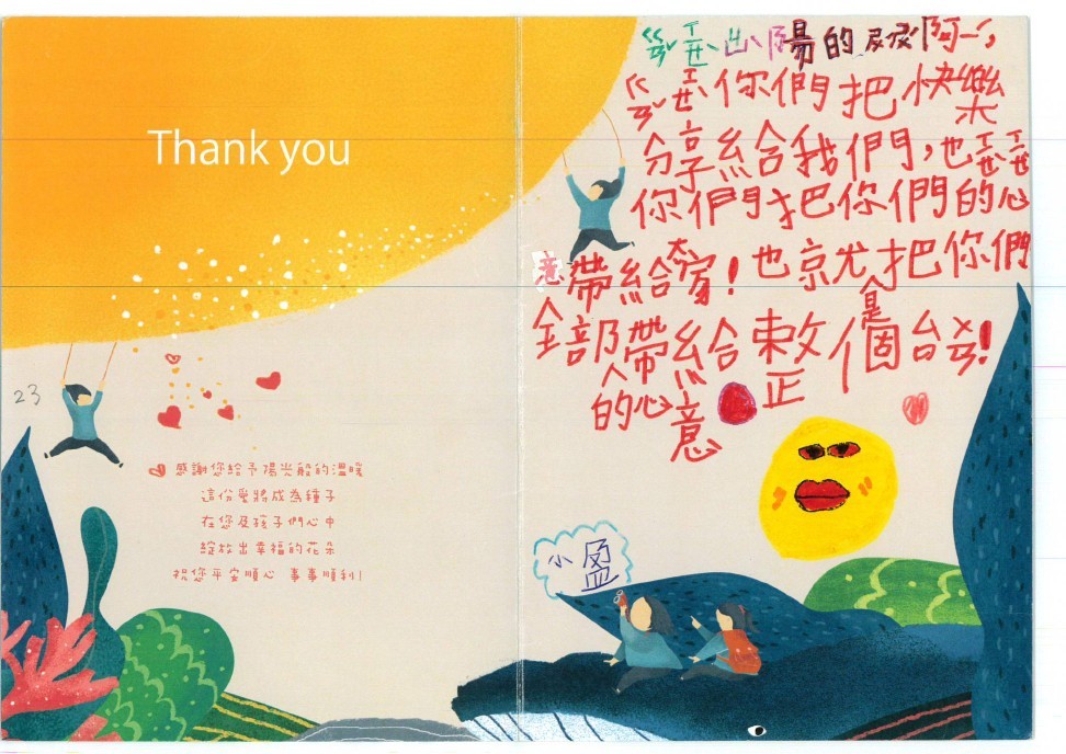 Dear 田倩宜:您好,感謝您參與「 2025聚陽實業-成為那道陽光」心願活動,已將您的心意,發送到孩子的手上囉!為了將這一切永遠紀錄下來,我們將孩子給您的感謝卡片掃描成圖檔上傳至此,讓您可以回顧這一整個歷程。感謝您的愛心,未來也請繼續支持聚陽實業心願活動。如有疑問,請聯繫永續發展部-Kelly#1156、Tina#1152。