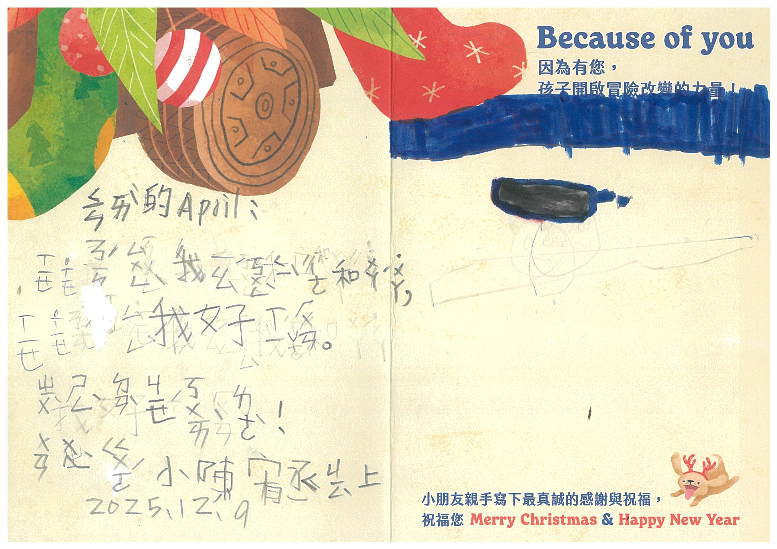 Aprilrun 您好:我們已在12/6(六)已將禮物發送到孩子的手上嚕!在發送禮物前, 我們特別為孩子設計〈品格營〉及〈反思課程〉, 最後進行〈冒險小勇者聖誕挑戰賽〉,希望能讓孩子們從心裡面長出勇氣與自信。 特地將小朋友寫給您的感謝卡片掃描成圖檔,記錄這美好的時刻。近日您也會收到孩子寫給您的感謝卡片及我們小小心意的禮物:)