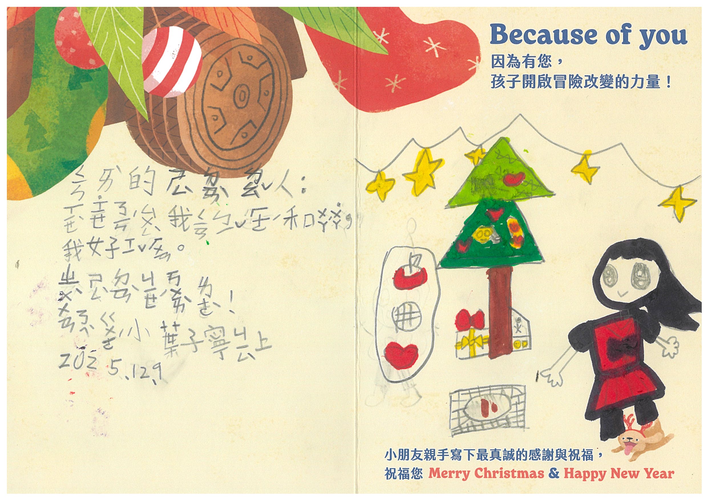 chiamay 您好:我們已在12/6(六)已將禮物發送到孩子的手上嚕!在發送禮物前, 我們特別為孩子設計〈品格營〉及〈反思課程〉, 最後進行〈冒險小勇者聖誕挑戰賽〉,希望能讓孩子們從心裡面長出勇氣與自信。 特地將小朋友寫給您的感謝卡片掃描成圖檔,記錄這美好的時刻。近日您也會收到孩子寫給您的感謝卡片及我們小小心意的禮物:)