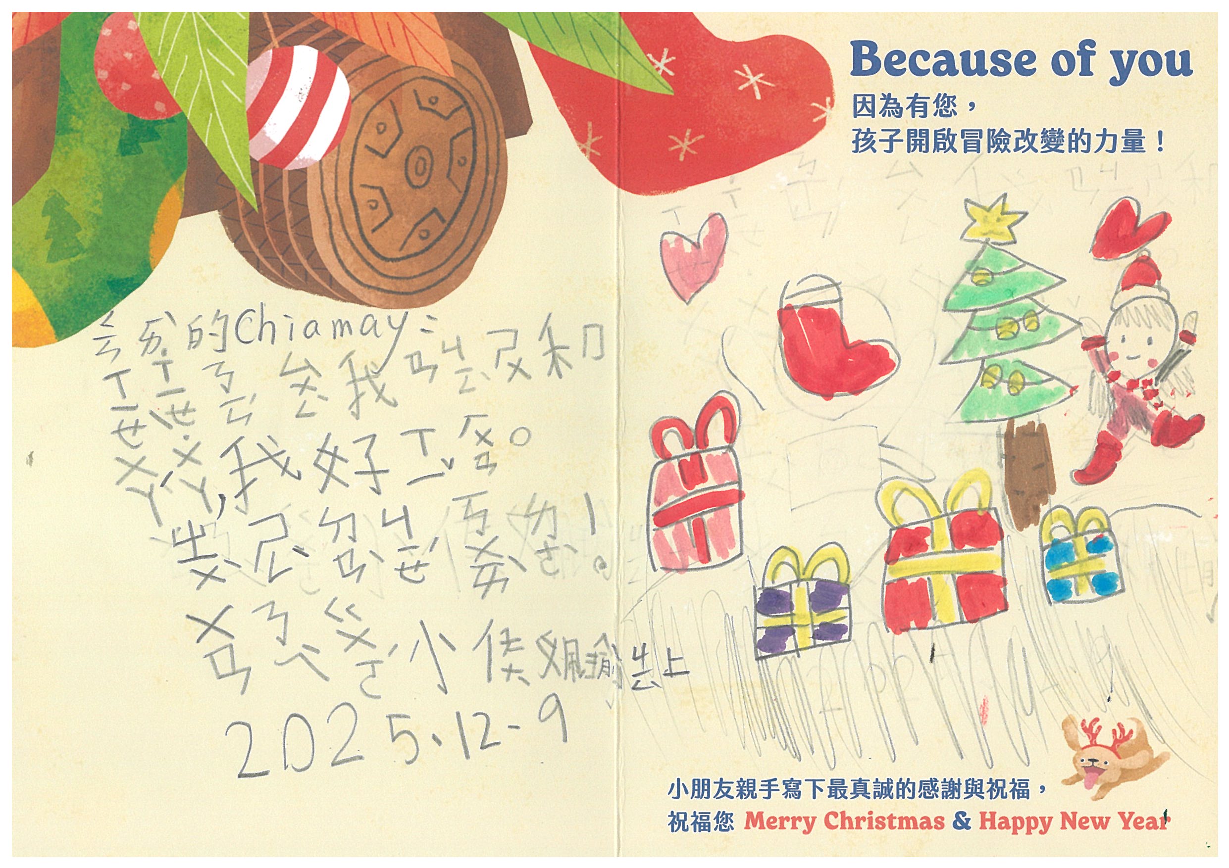 chiamay 您好:我們已在12/6(六)已將禮物發送到孩子的手上嚕!在發送禮物前, 我們特別為孩子設計〈品格營〉及〈反思課程〉, 最後進行〈冒險小勇者聖誕挑戰賽〉,希望能讓孩子們從心裡面長出勇氣與自信。 特地將小朋友寫給您的感謝卡片掃描成圖檔,記錄這美好的時刻。近日您也會收到孩子寫給您的感謝卡片及我們小小心意的禮物:)