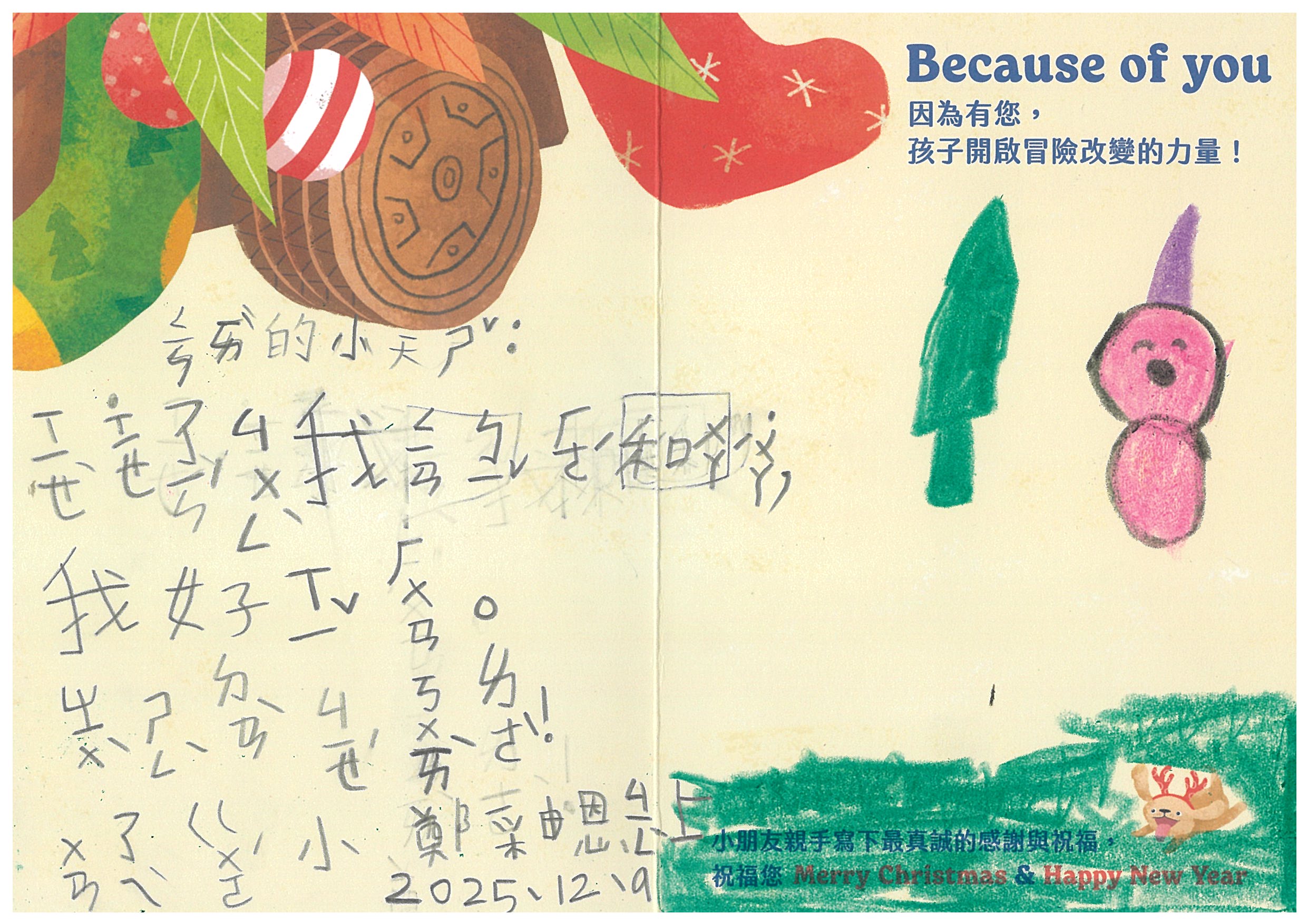 brandilin 您好:我們已在12/6(六)已將禮物發送到孩子的手上嚕!在發送禮物前, 我們特別為孩子設計〈品格營〉及〈反思課程〉, 最後進行〈冒險小勇者聖誕挑戰賽〉,希望能讓孩子們從心裡面長出勇氣與自信。 特地將小朋友寫給您的感謝卡片掃描成圖檔,記錄這美好的時刻。近日您也會收到孩子寫給您的感謝卡片及我們小小心意的禮物:)