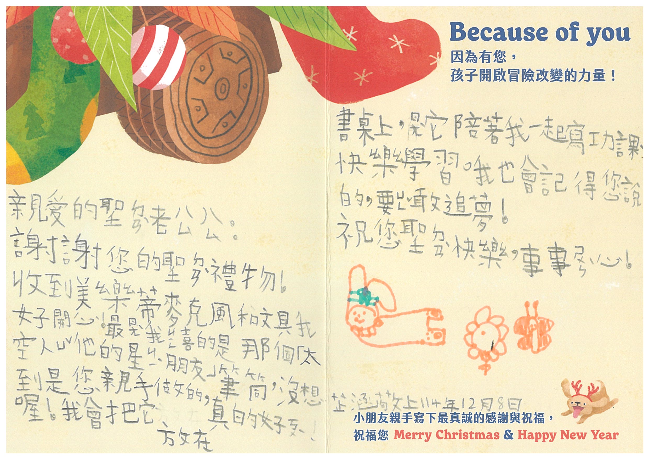Omomolove 您好:我們已在12/6(六)已將禮物發送到孩子的手上嚕!在發送禮物前, 我們特別為孩子設計〈品格營〉及〈反思課程〉, 最後進行〈冒險小勇者聖誕挑戰賽〉,希望能讓孩子們從心裡面長出勇氣與自信。 特地將小朋友寫給您的感謝卡片掃描成圖檔,記錄這美好的時刻。近日您也會收到孩子寫給您的感謝卡片及我們小小心意的禮物:)