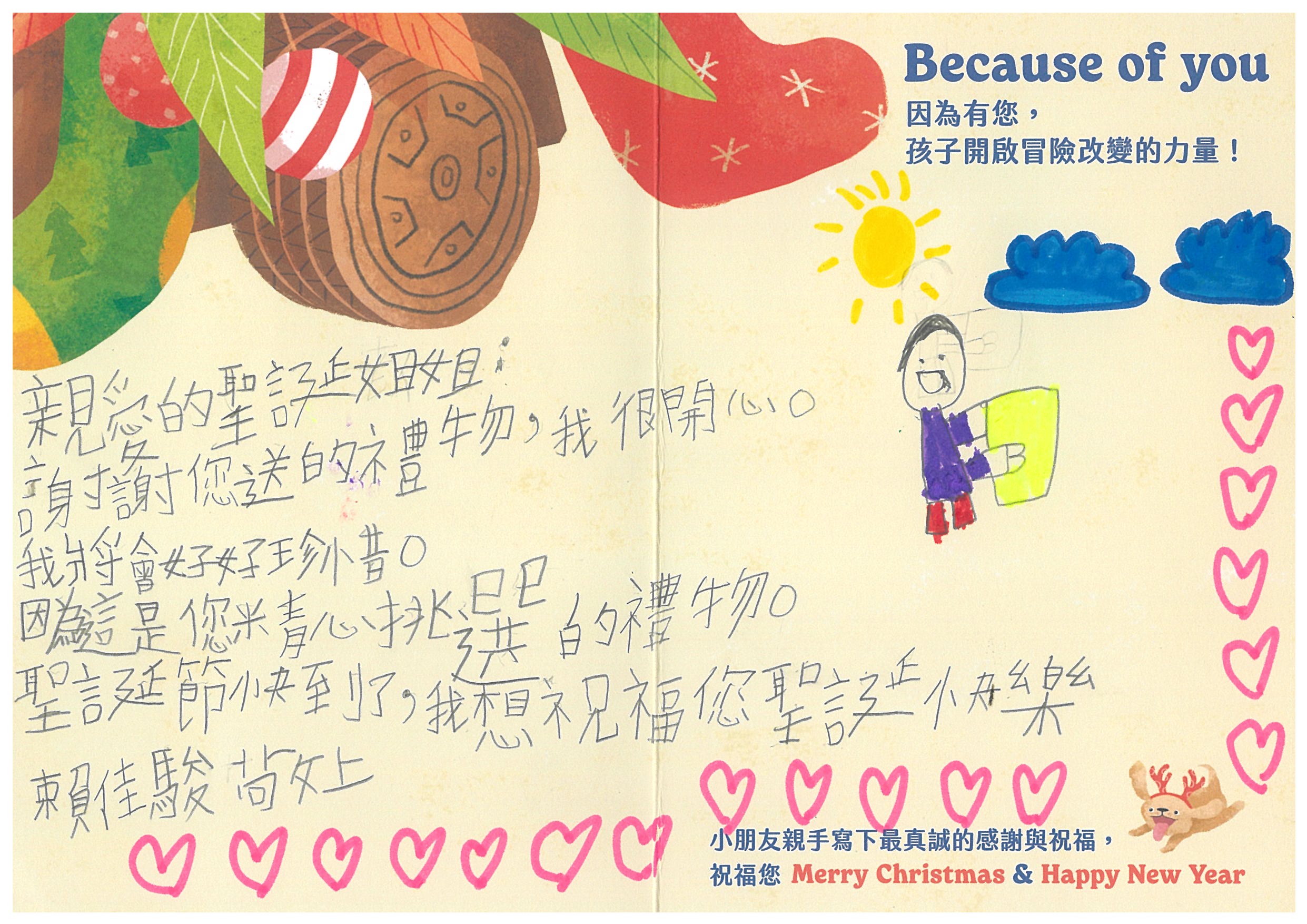 每份聖誕禮物內容:小朋友許下的心願禮物+親手寫下的鼓勵祝福卡片1張