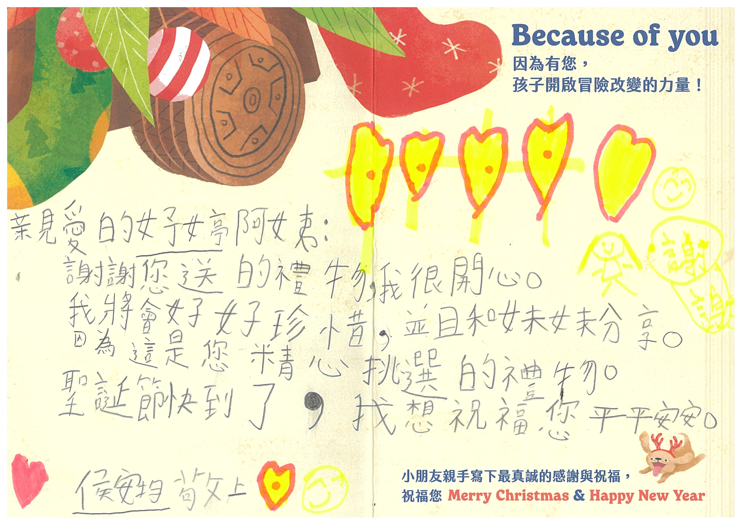 妤婷 您好:我們已在12/6(六)已將禮物發送到孩子的手上嚕!在發送禮物前, 我們特別為孩子設計〈品格營〉及〈反思課程〉, 最後進行〈冒險小勇者聖誕挑戰賽〉,希望能讓孩子們從心裡面長出勇氣與自信。 特地將小朋友寫給您的感謝卡片掃描成圖檔,記錄這美好的時刻。
