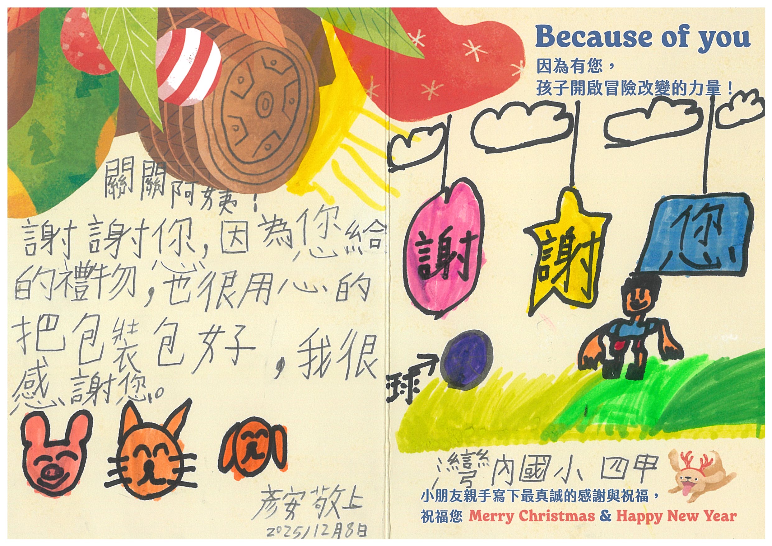 關小姐 您好:我們已在12/6(六)已將禮物發送到孩子的手上嚕!在發送禮物前, 我們特別為孩子設計〈品格營〉及〈反思課程〉, 最後進行〈冒險小勇者聖誕挑戰賽〉,希望能讓孩子們從心裡面長出勇氣與自信。 特地將小朋友寫給您的感謝卡片掃描成圖檔,記錄這美好的時刻。