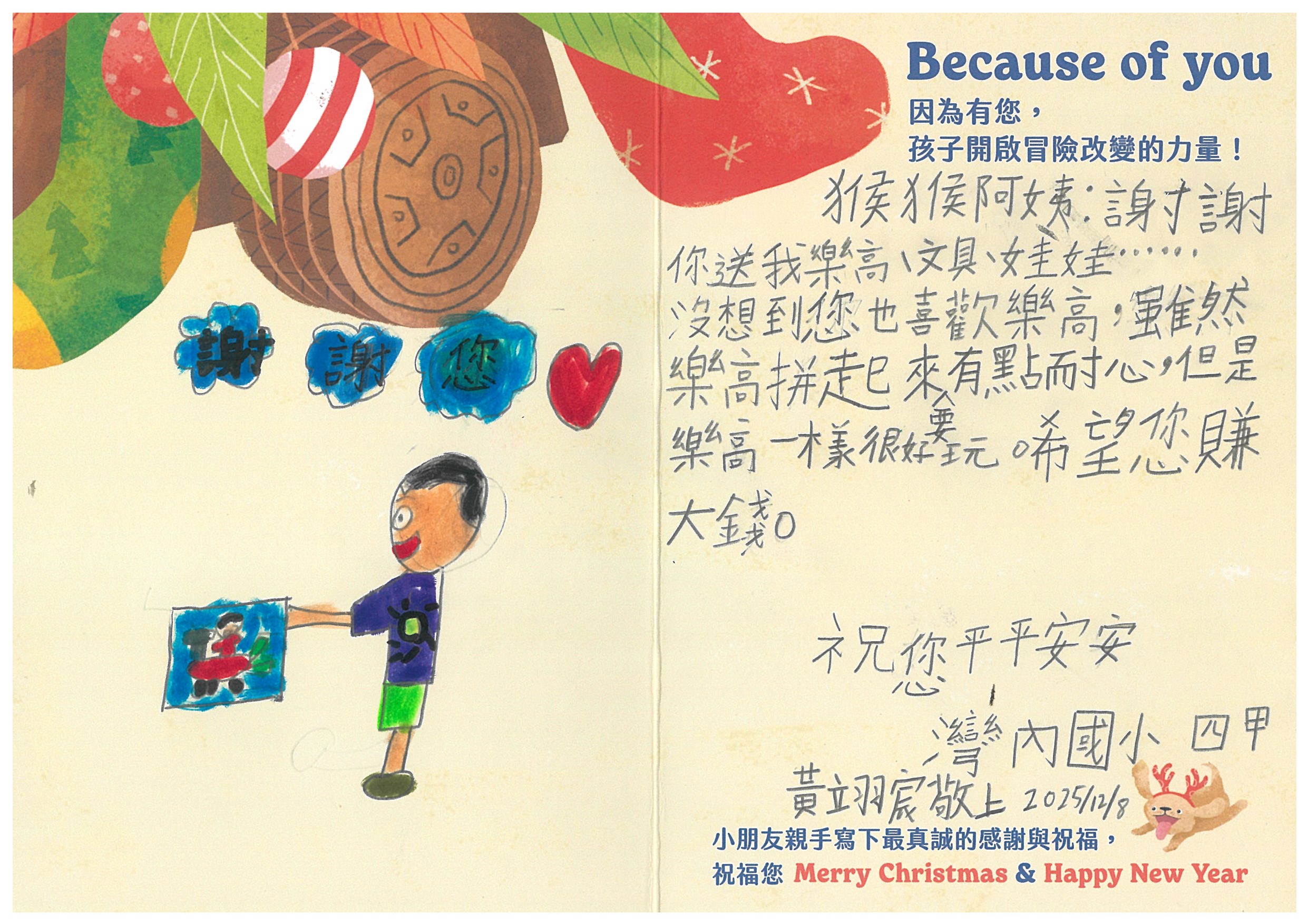 每份聖誕禮物內容:小朋友許下的心願禮物+親手寫下的鼓勵祝福卡片1張