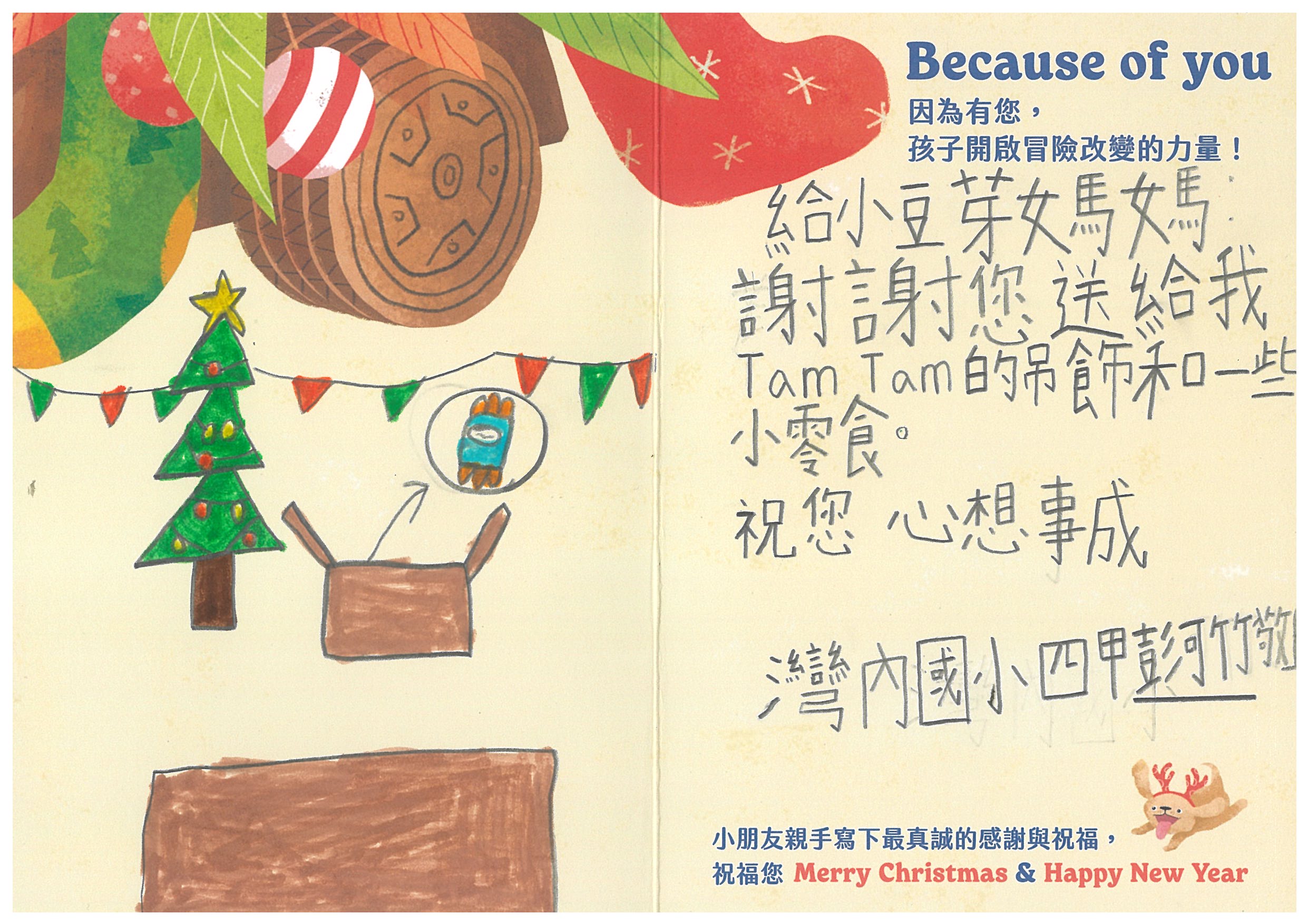 豆芽與豆龍的媽媽 您好:我們已在12/6(六)已將禮物發送到孩子的手上嚕!在發送禮物前, 我們特別為孩子設計〈品格營〉及〈反思課程〉, 最後進行〈冒險小勇者聖誕挑戰賽〉,希望能讓孩子們從心裡面長出勇氣與自信。 特地將小朋友寫給您的感謝卡片掃描成圖檔,記錄這美好的時刻。先前已寄出到孩子寫給您的感謝卡片及我們小小心意的禮物:)