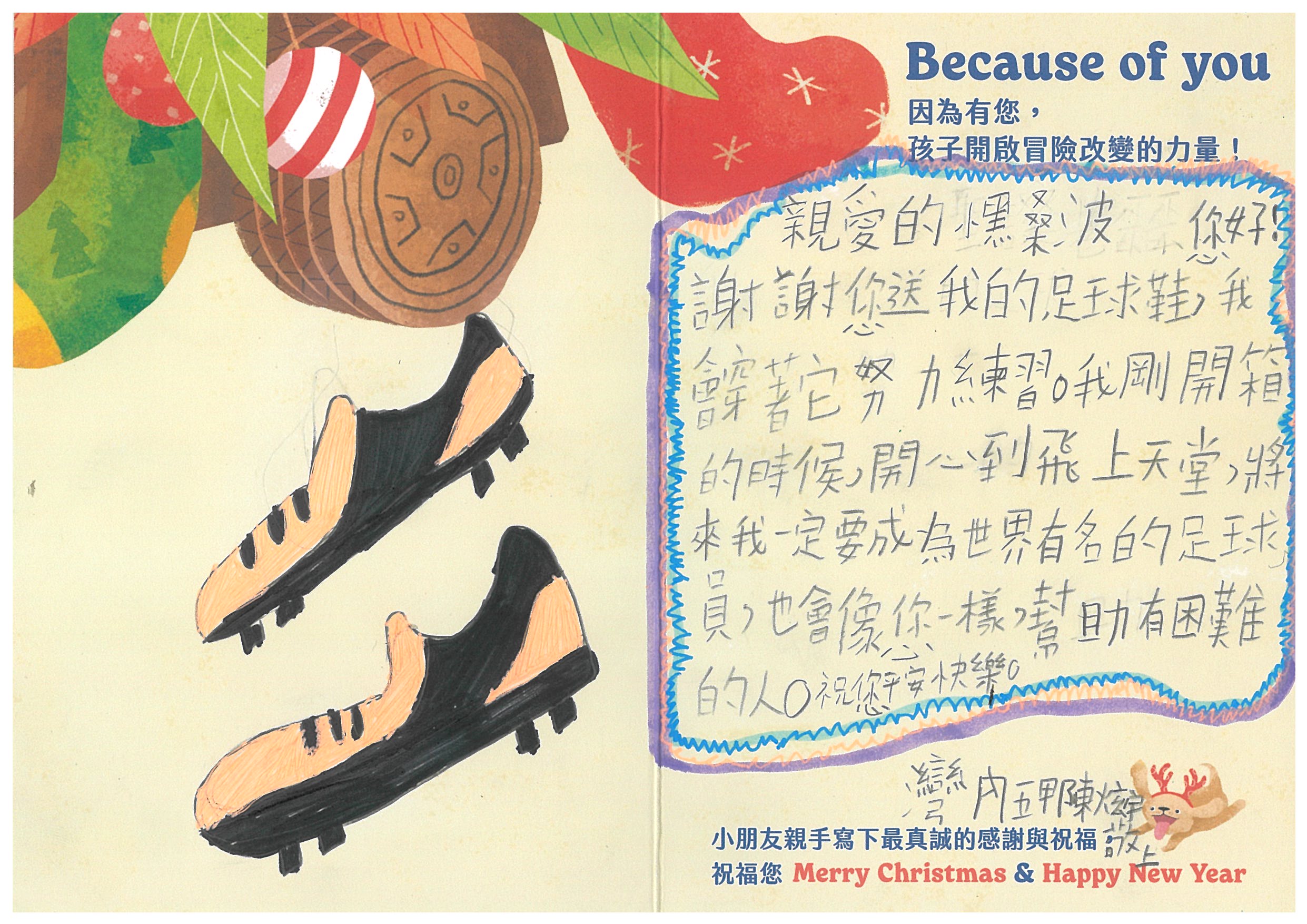 小黑桑波 您好:我們已在12/6(六)已將禮物發送到孩子的手上嚕!在發送禮物前, 我們特別為孩子設計〈品格營〉及〈反思課程〉, 最後進行〈冒險小勇者聖誕挑戰賽〉,希望能讓孩子們從心裡面長出勇氣與自信。 特地將小朋友寫給您的感謝卡片掃描成圖檔,記錄這美好的時刻。先前已寄出到孩子寫給您的感謝卡片及我們小小心意的禮物:)