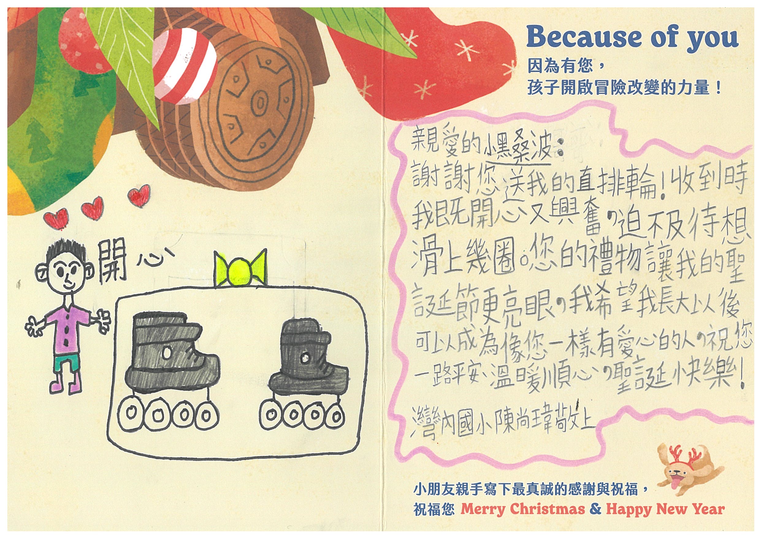 每份聖誕禮物內容:小朋友許下的心願禮物+親手寫下的鼓勵祝福卡片1張