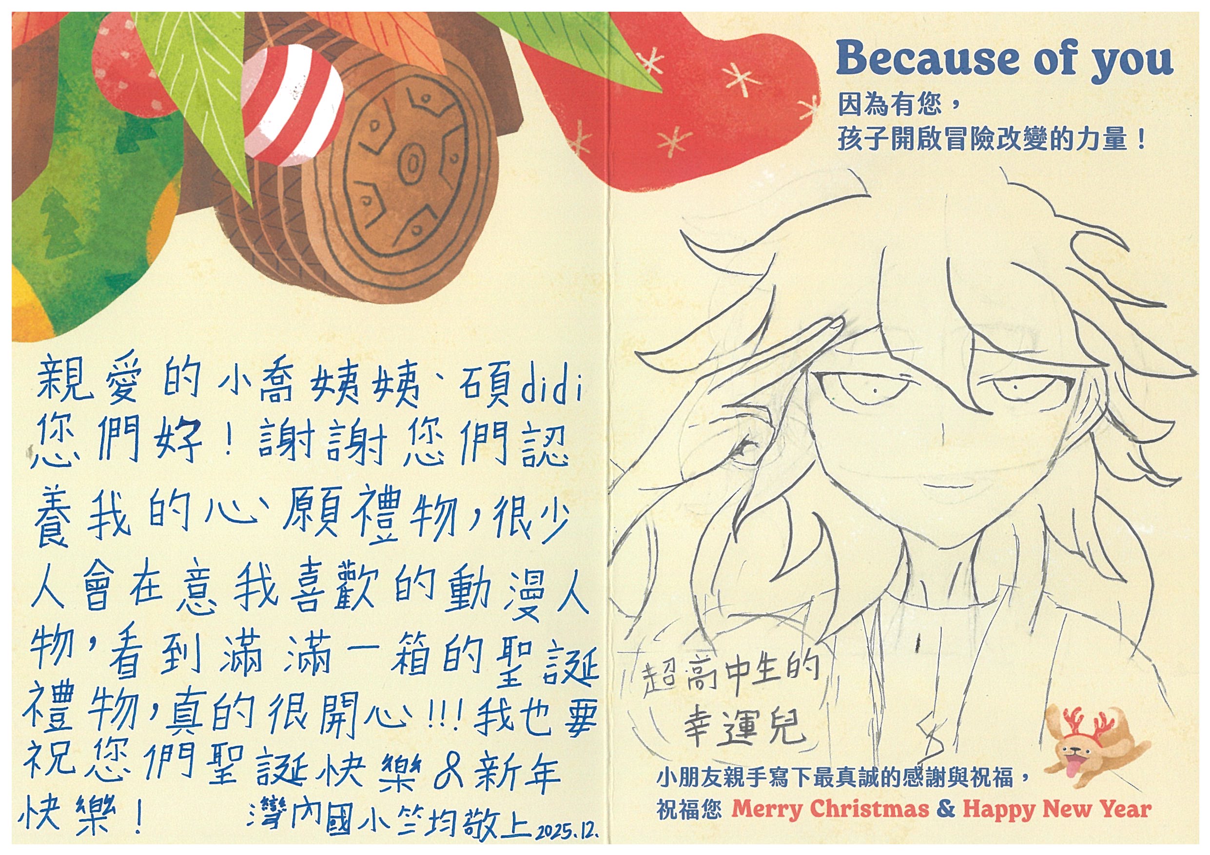 每份聖誕禮物內容:小朋友許下的心願禮物+親手寫下的鼓勵祝福卡片1張