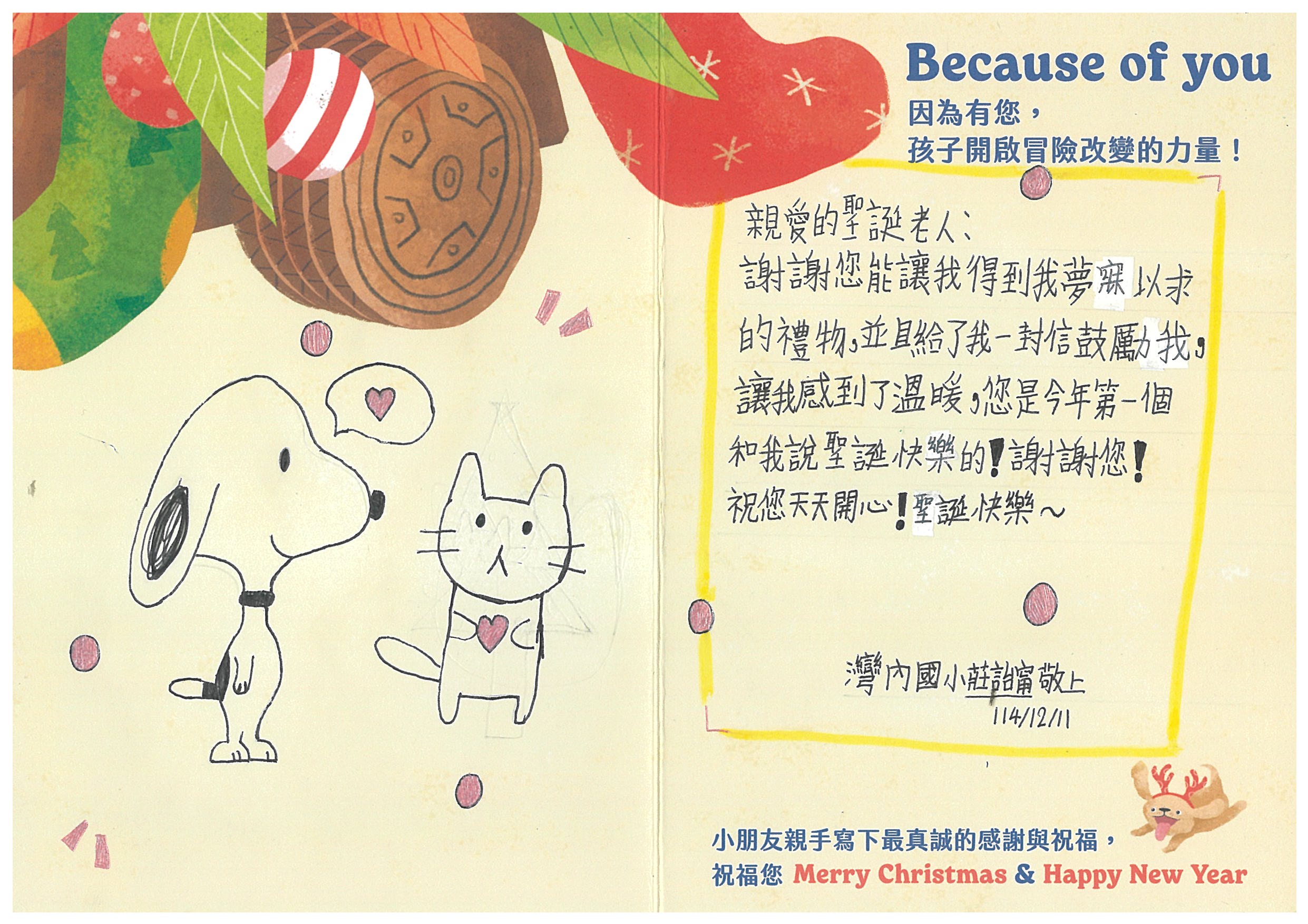 AJLI 您好:我們已在12/6(六)已將禮物發送到孩子的手上嚕!在發送禮物前, 我們特別為孩子設計〈品格營〉及〈反思課程〉, 最後進行〈冒險小勇者聖誕挑戰賽〉,希望能讓孩子們從心裡面長出勇氣與自信。 特地將小朋友寫給您的感謝卡片掃描成圖檔,記錄這美好的時刻。先前已寄出到孩子寫給您的感謝卡片及我們小小心意的禮物:)