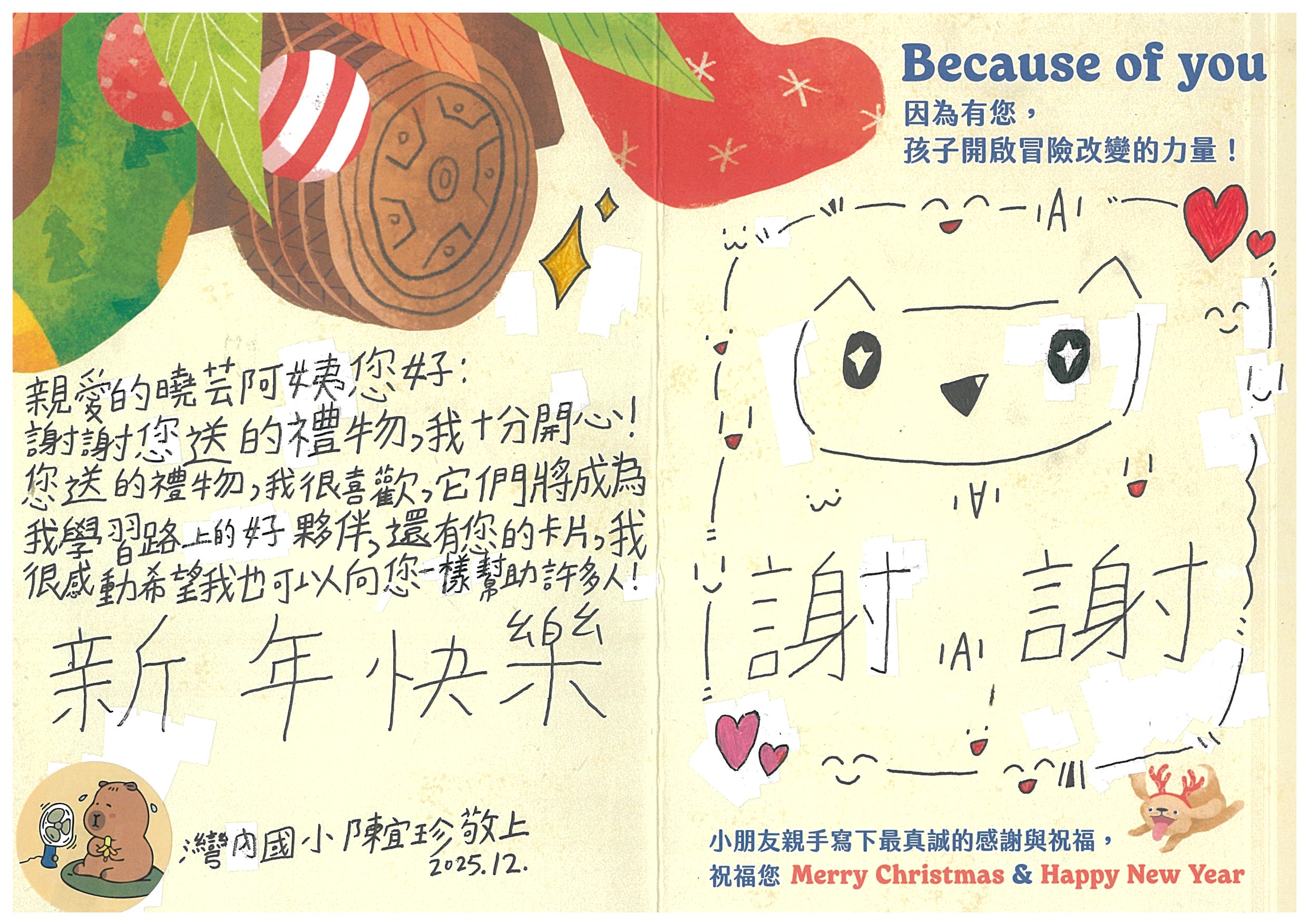 每份聖誕禮物內容:小朋友許下的心願禮物+親手寫下的鼓勵祝福卡片1張