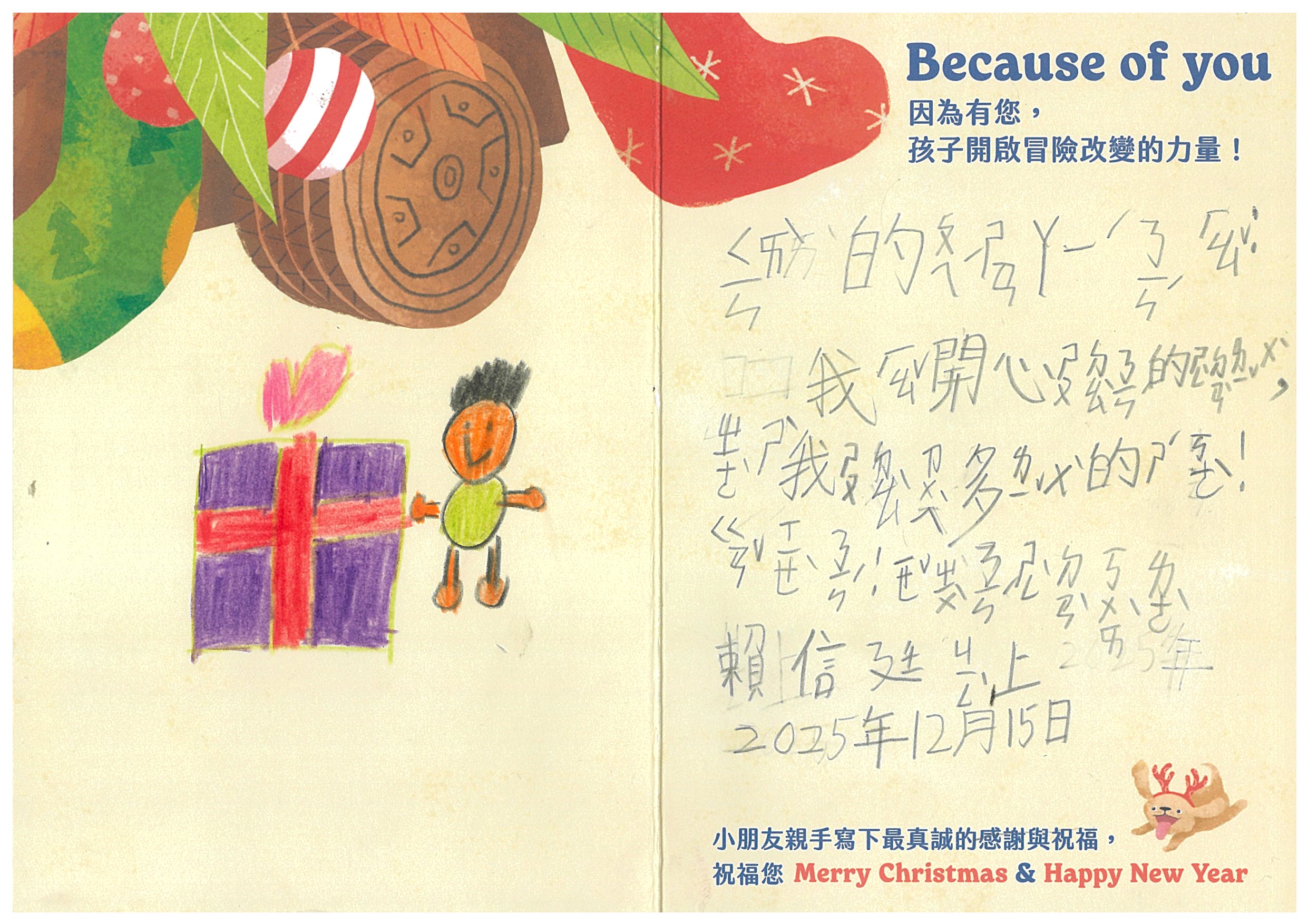 tweety21 您好:我們已在12/6(六)已將禮物發送到孩子的手上嚕!在發送禮物前, 我們特別為孩子設計〈品格營〉及〈反思課程〉, 最後進行〈冒險小勇者聖誕挑戰賽〉,希望能讓孩子們從心裡面長出勇氣與自信。 特地將小朋友寫給您的感謝卡片掃描成圖檔,記錄這美好的時刻。先前已寄出到孩子寫給您的感謝卡片及我們小小心意的禮物:)