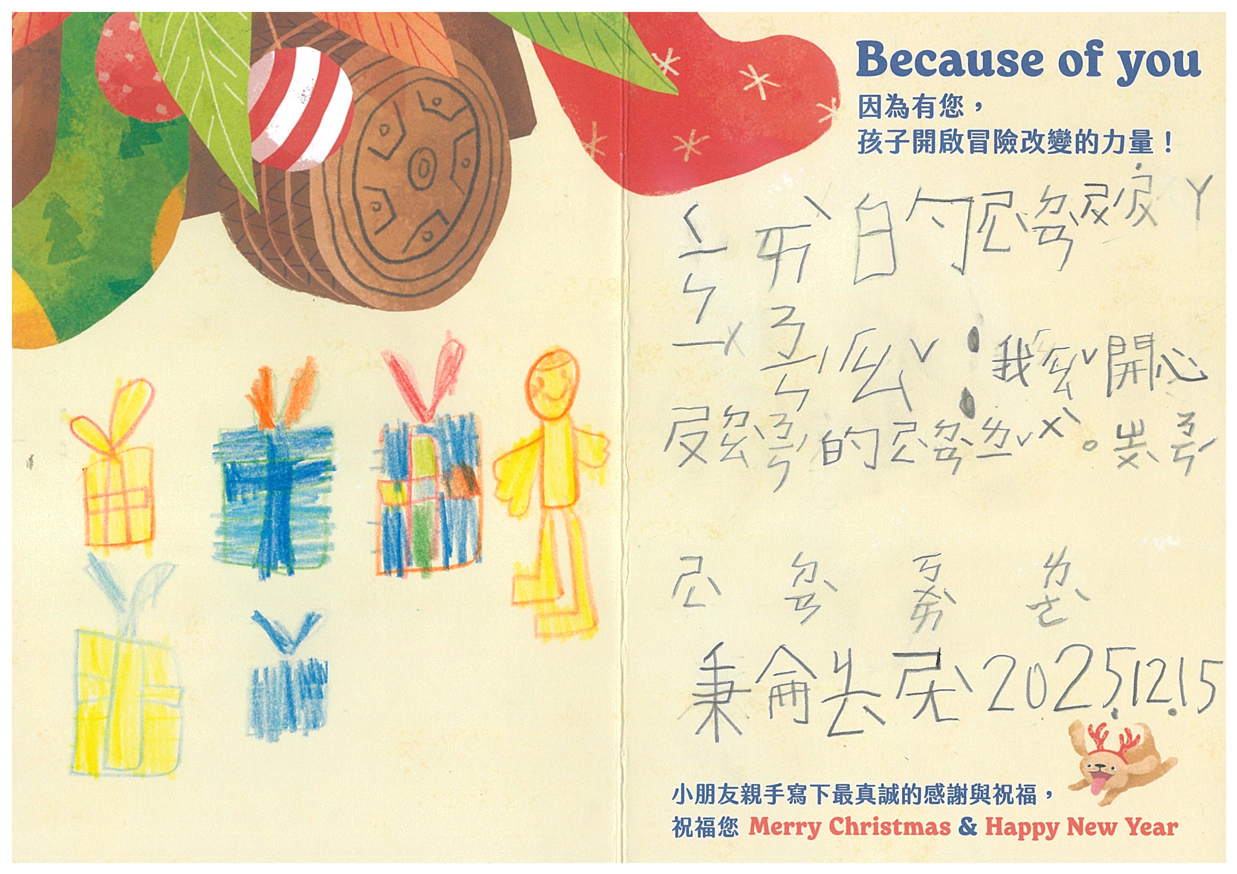 ConnieShen 您好:我們已在12/6(六)已將禮物發送到孩子的手上嚕!在發送禮物前, 我們特別為孩子設計〈品格營〉及〈反思課程〉, 最後進行〈冒險小勇者聖誕挑戰賽〉,希望能讓孩子們從心裡面長出勇氣與自信。 特地將小朋友寫給您的感謝卡片掃描成圖檔,記錄這美好的時刻。先前已寄出到孩子寫給您的感謝卡片及我們小小心意的禮物:)