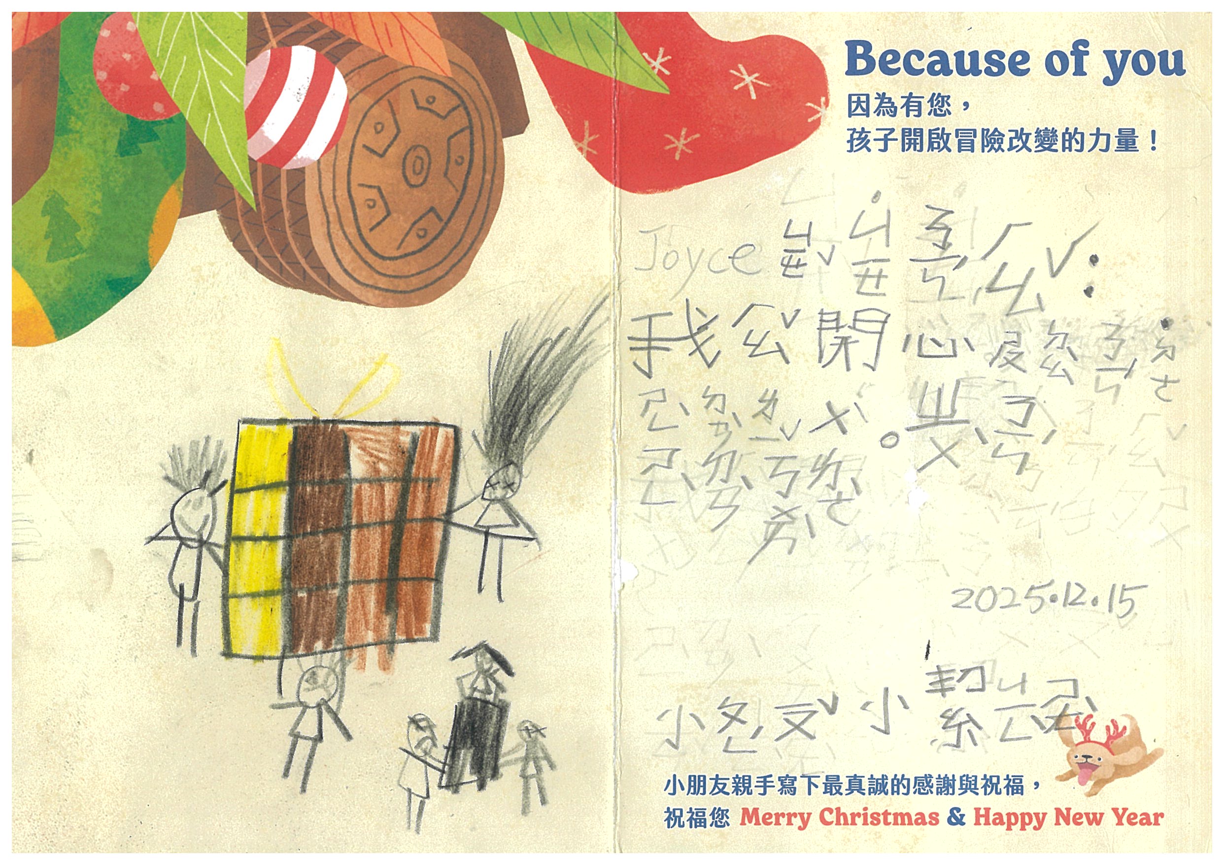 JoyceShieh 您好:我們已在12/6(六)已將禮物發送到孩子的手上嚕!在發送禮物前, 我們特別為孩子設計〈品格營〉及〈反思課程〉, 最後進行〈冒險小勇者聖誕挑戰賽〉,希望能讓孩子們從心裡面長出勇氣與自信。 特地將小朋友寫給您的感謝卡片掃描成圖檔,記錄這美好的時刻。先前已寄出到孩子寫給您的感謝卡片及我們小小心意的禮物:)