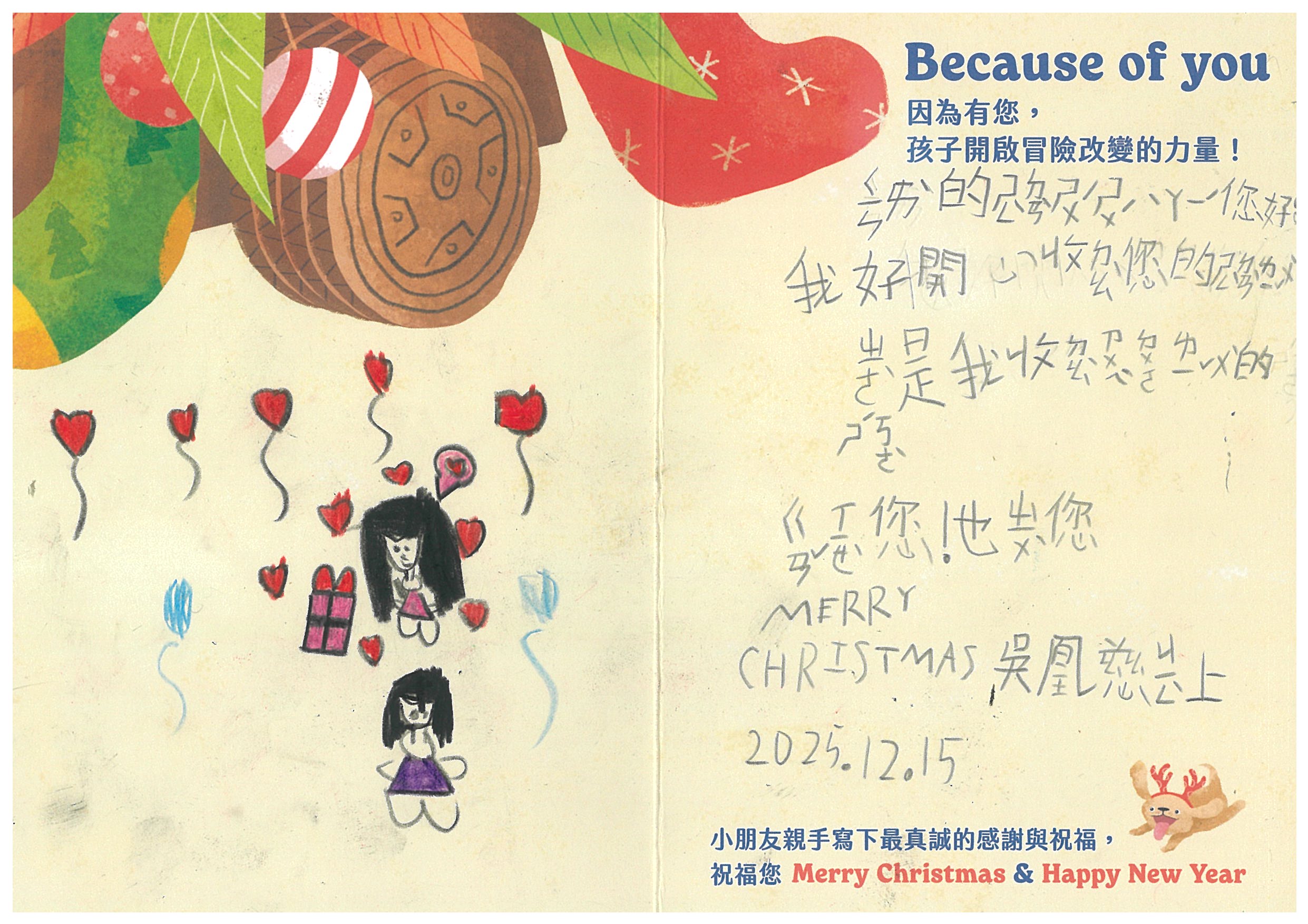 每份聖誕禮物內容:小朋友許下的心願禮物+親手寫下的鼓勵祝福卡片1張